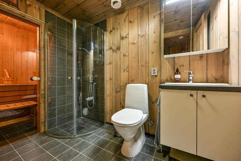 Bad 1: Bruser og WC. Bad 2: Bruser, WC og sauna.