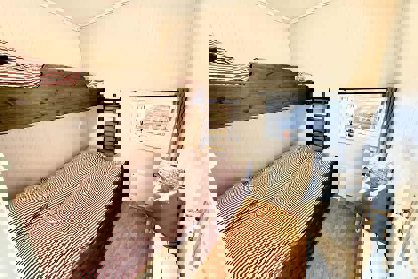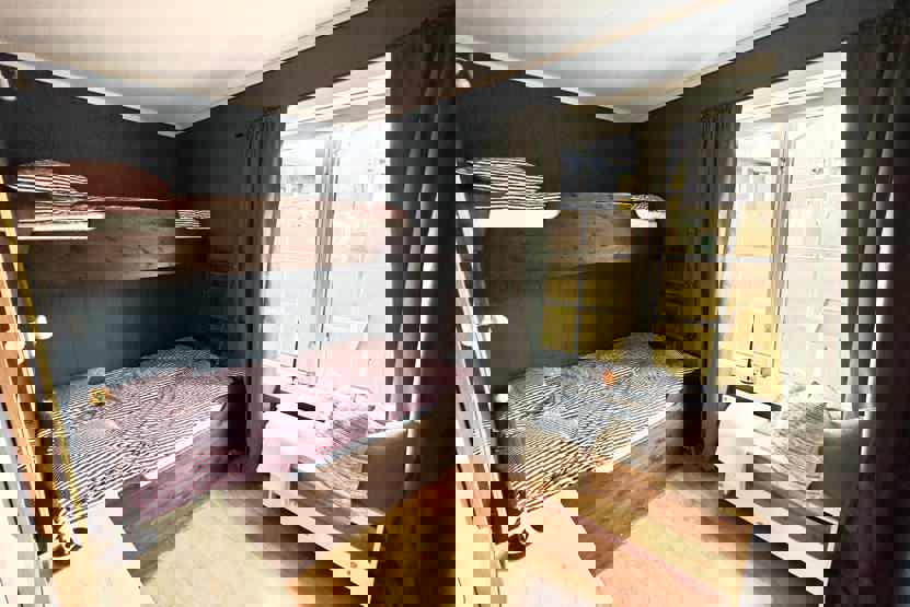 Soveværelse 1: 1 dobbeltseng 180 cm bred. Soveværelse 2: 1 køjeseng med 150 cm bred underkøje og 75 cm bred overkøje. Soveværelse 3: 1 køjeseng med 150 cm bred underkøje og 75 cm bred overkøje.
