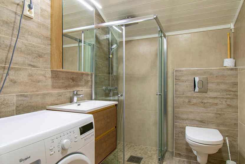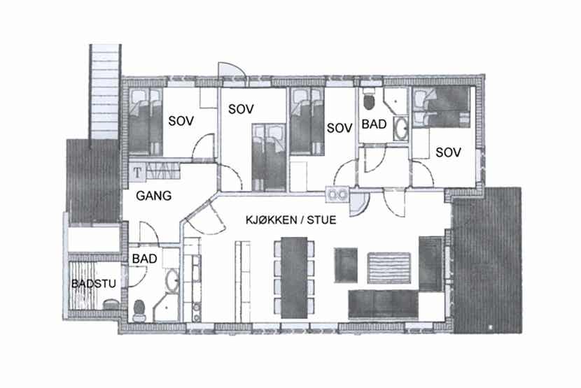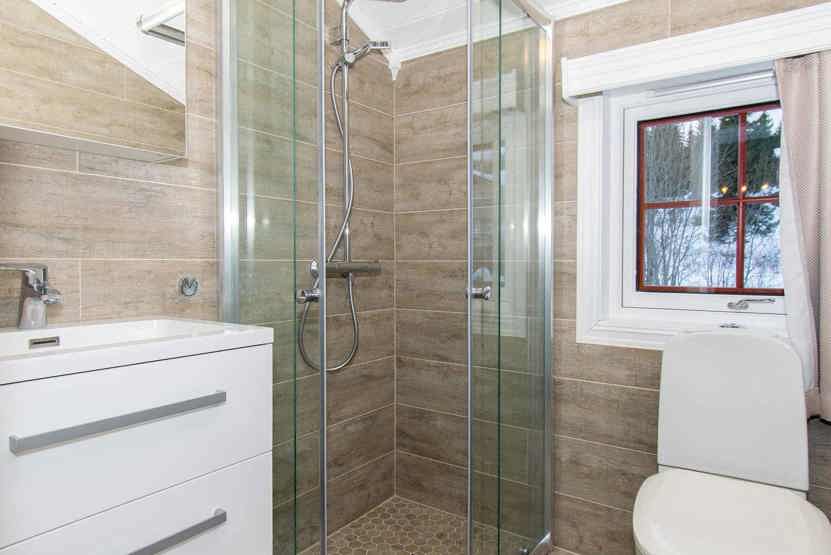 Bad 1: Bruser og WC. Bad 2: Bruser, WC og sauna.