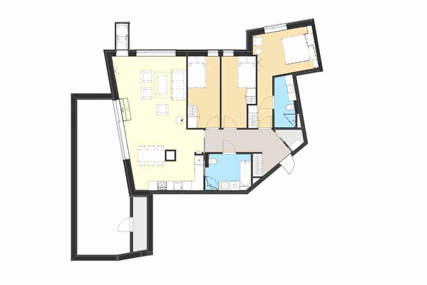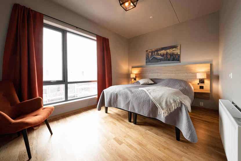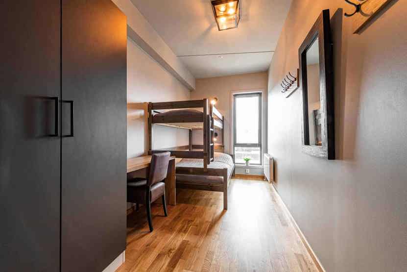 Lys og moderne lejlighed på 4. sal. Kombineret opholdsstue med pejs ovn, TV og sovesofa. køkkenafdeling: 3 soveværelser, 2 brusere, 2 WC. Vaskemaskine, tørretumbler 2 P-plads i garage til 2 biler (max højde 2,10m) adgang til elbilopladere med type 2 stik mod betaling, elevator findes i huset. Skiskab findes i byg A.