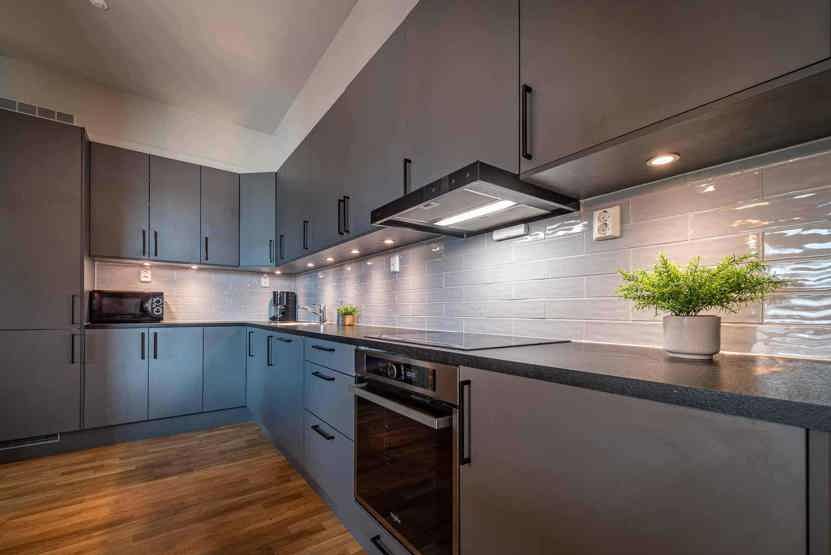Køkken: Enheden har komfur med ovn, opvaskemaskine, mikrobølgeovn, køleskab, fryser.
