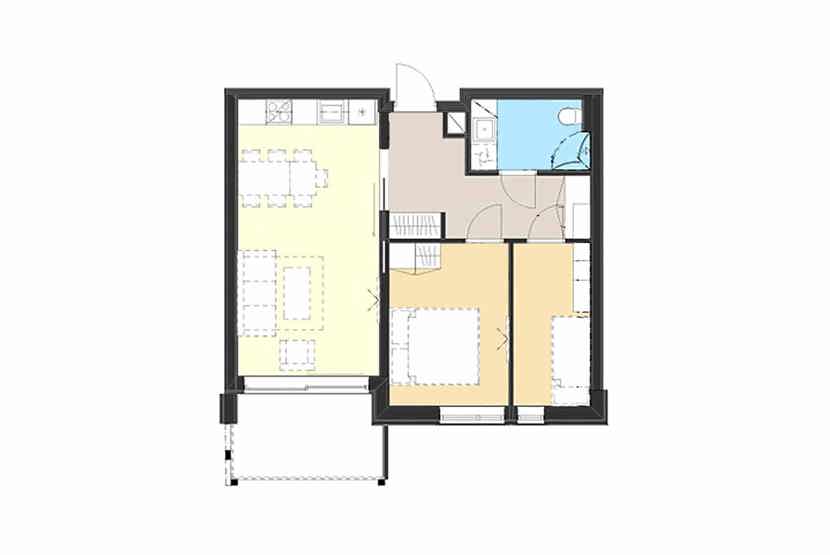 Lys og moderne lejlighed på 2. sal. Kombineret opholdsstue, TV og sovesofa. køkkenafdeling: 2 soveværelser, 1 brusere, 1 WC, adgang til bilopladere med type 2 stik mod betaling, 1 P-plads i garage til 1 bil (max højde 2,10m) elevator findes i bygning. Skiskab findes i byg A.