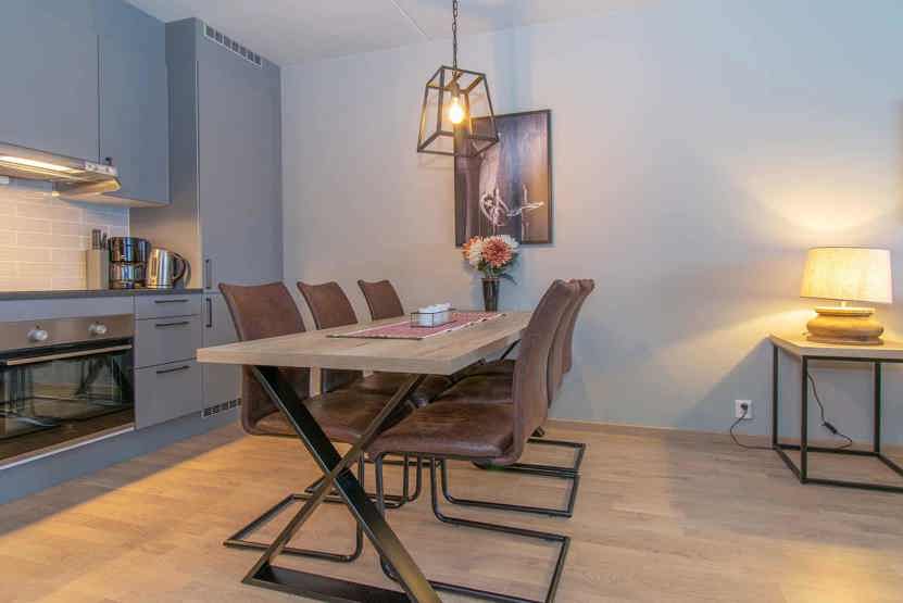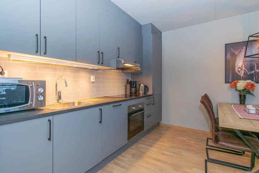 Enheden har komfur med ovn, mikrobølgeovn, opvaskemaskine, køleskab, fryser.