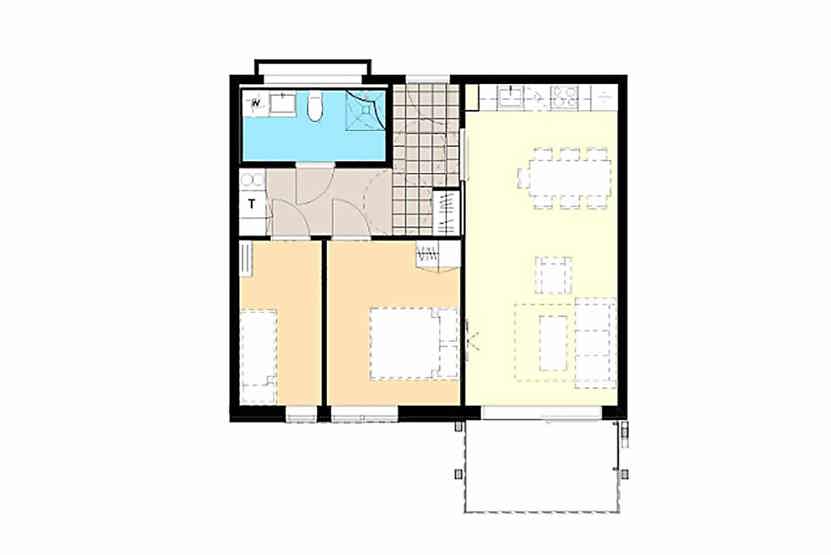 Lys og moderne lejlighed på 2. sal. Kombineret opholdsstue, TV og sovesofa. køkkenafdeling: 2 soveværelser, 1 brusere, 1 WC, kombineret vaskemaskine/tørretumbler, 1 P-plads i garage til 1 bil (max højde 2,10m), elevator findes i bygning. Skiskab findes i byg A.