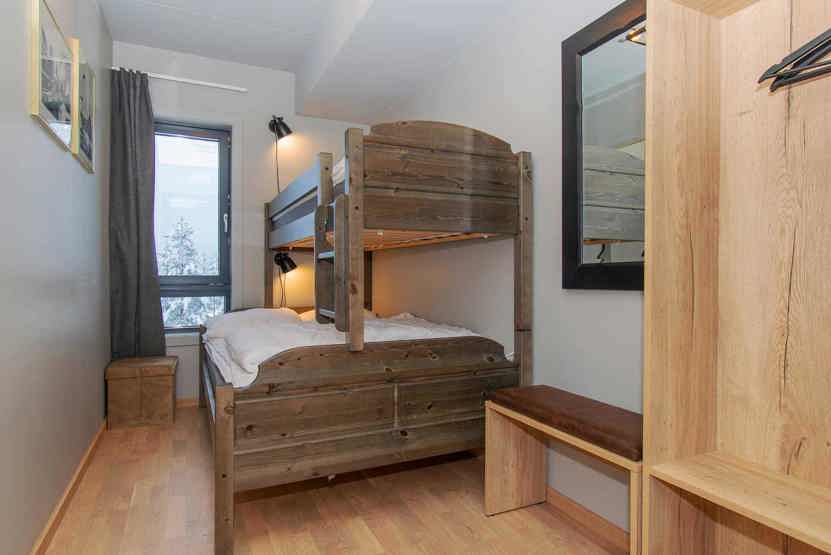 Soveværelse-1= 1 dobbeltseng 160 cm bred. Soveværelse-2= 1 køjeseng med 120 cm bred underkøje og 80 cm bred overkøje.