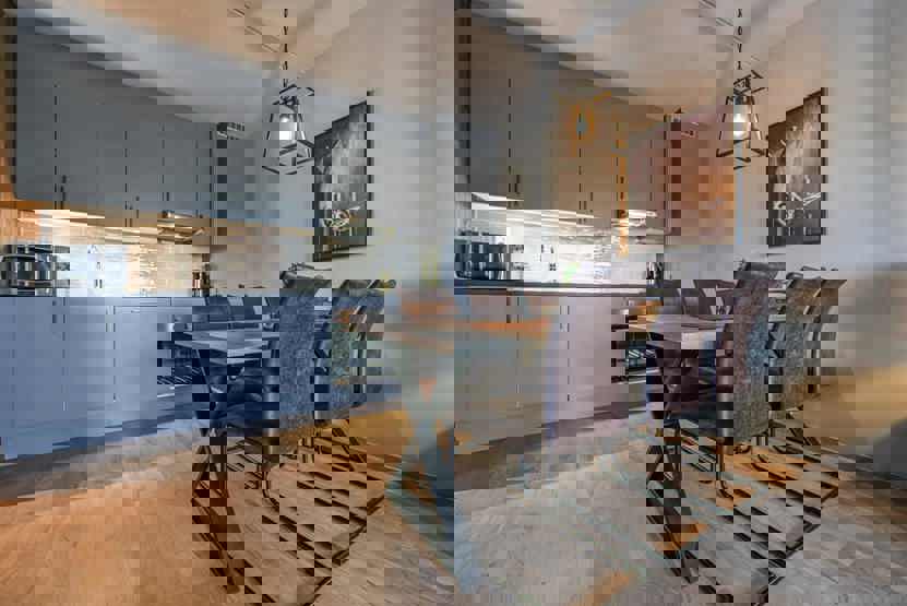 Enheden har komfur med ovn, køleskab, fryser, opvaskemaskine, mikrobølgeovn.