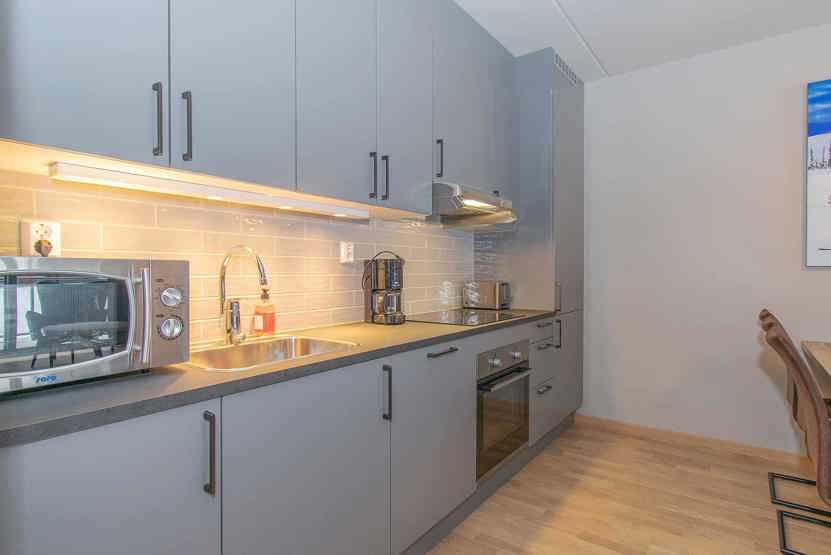 Enheden har komfur med ovn, mikrobølgeovn, opvaskemaskine, køleskab, fryser.
