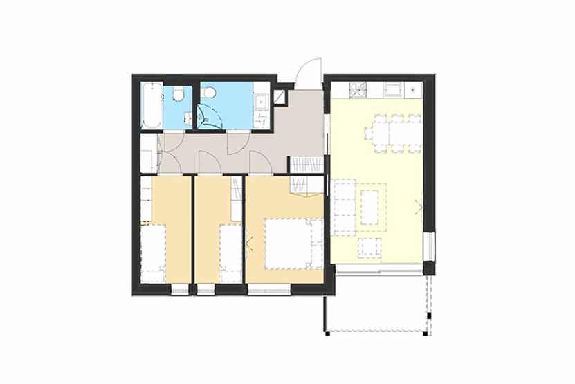 Soveværelse 1: 1 dobbeltseng 180 cm bred. Soveværelse 2: 1 køjeseng med 120 cm bred underkøje. Soveværelse 3: 1 køjeseng med 120 cm bred underkøje.