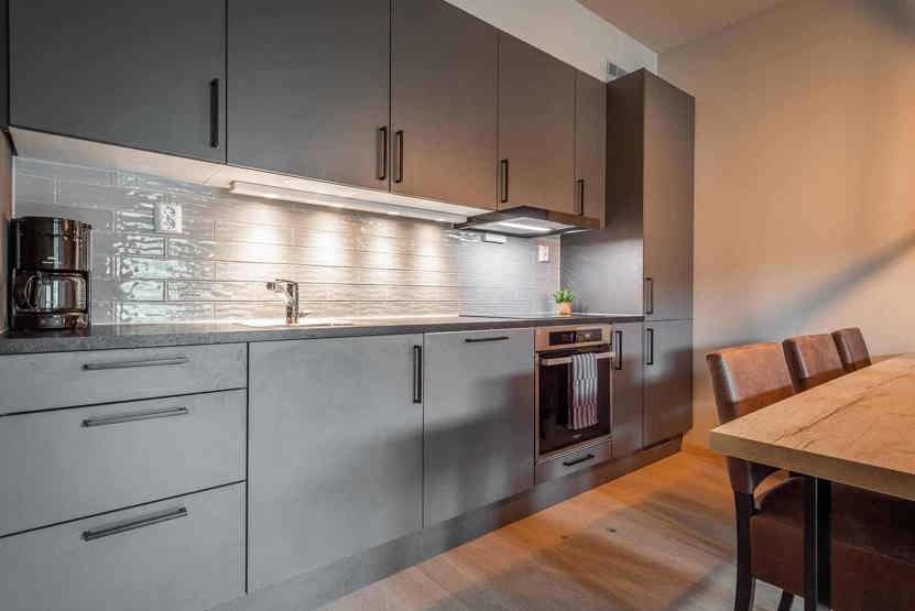 Køkken: Enheden har komfur med ovn, opvaskemaskine, mikrobølgeovn, køleskab, fryser.