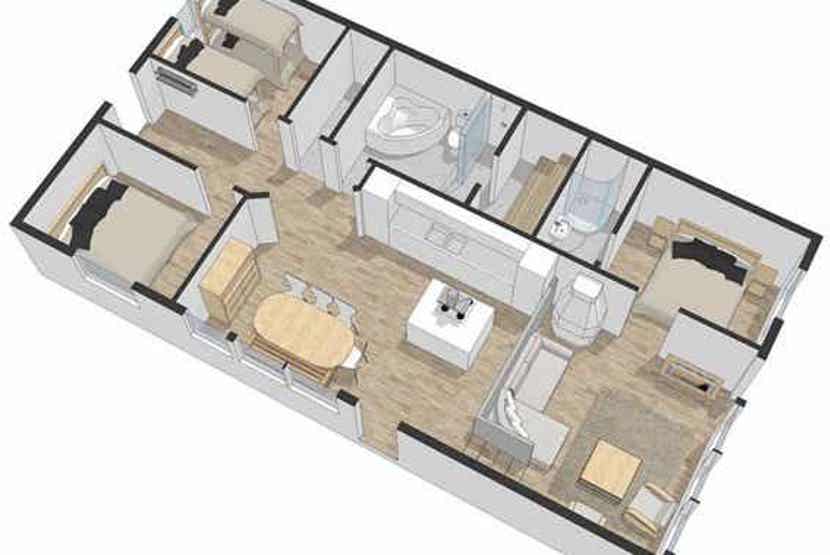 Enheden har komfur med ovn, køleskab, fryser, opvaskemaskine, mikrobølgeovn.
