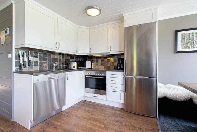 Køkken: Enheden har komfur med ovn, opvaskemaskine, mikrobølgeovn, køleskab, fryser.