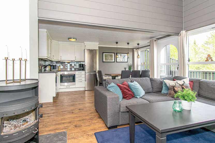 Lejlighed i 2 etager med 8 sengepladser, Køkkenafdeling med spiseplads. Opholdsstue med pejseovn og TV, 3 soveværelser. 1 bruser, 2 WC, 1 sauna.