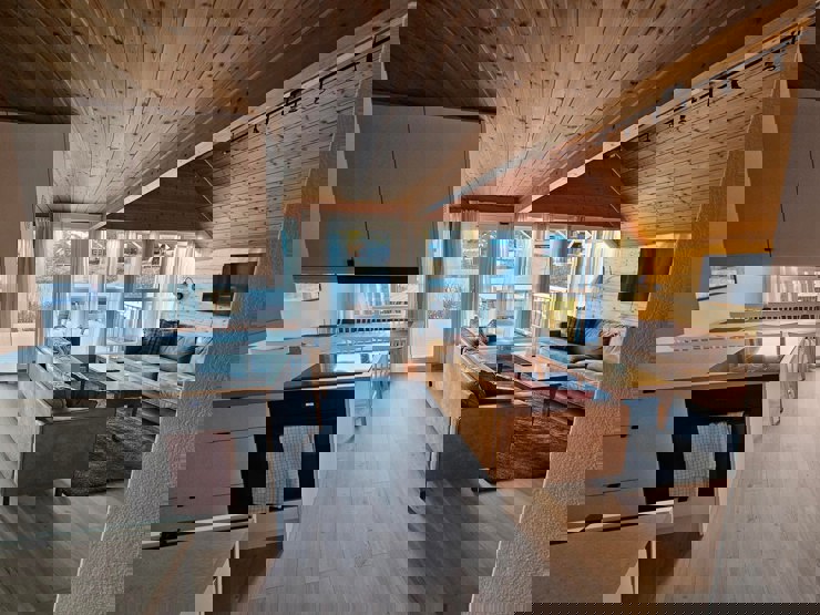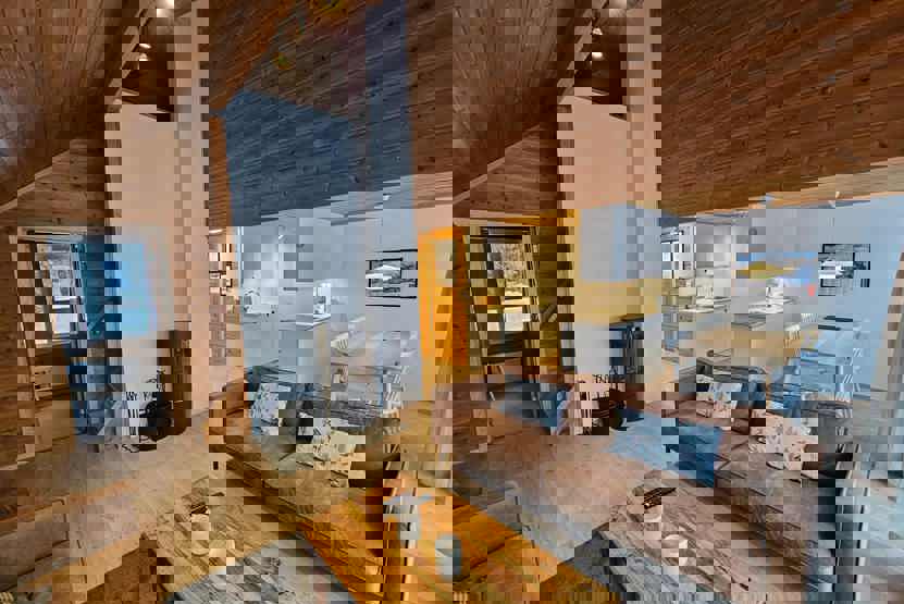 Lejlighed i 2 etager med 8 sengepladser, 81 kvm, 3 soveværelser. Køkkenafdeling med spiseplads. Opholdsstue med pejseovn og TV. 1 bruser, 1 WC, 1 sauna.