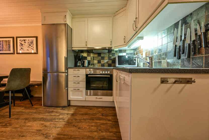 Køkken: Enheden har komfur med ovn, opvaskemaskine, mikrobølgeovn, køleskab, fryser.