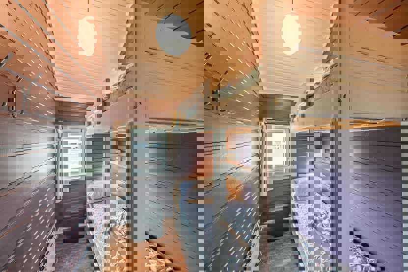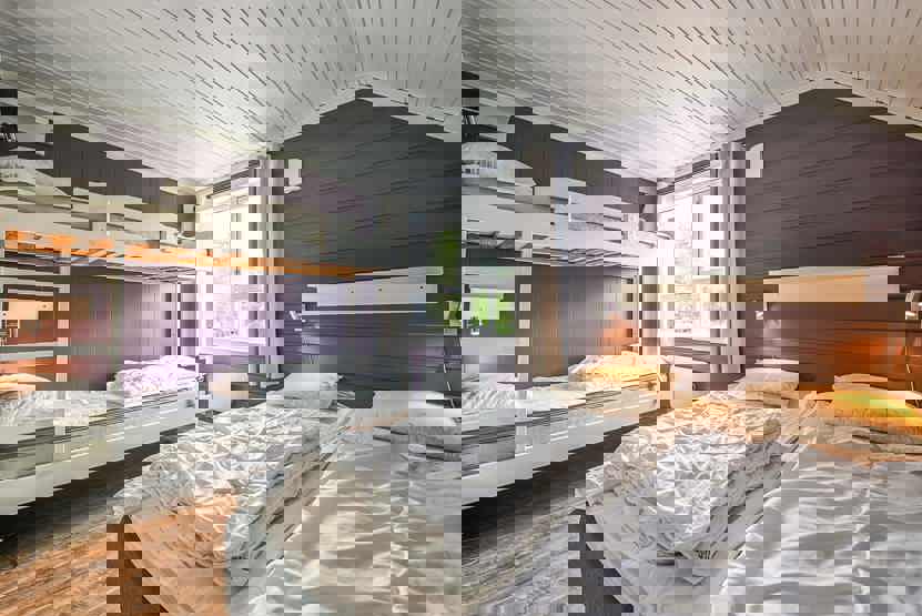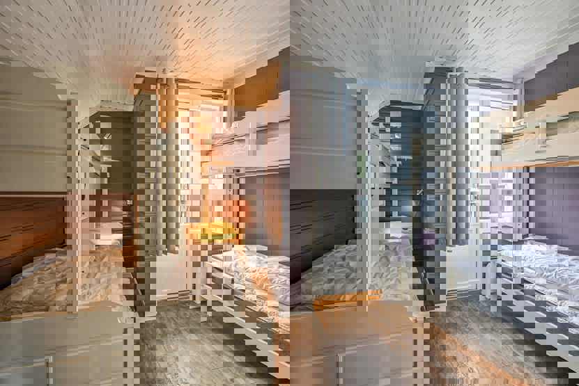 Soveværelse 1: 1 dobbeltseng som kan laves om til to enkeltsenge, 1 køjeseng 75 cm bred. Soveværelse 2: 1 køjeseng med 120 cm bred underkøje og 75 cm bred overkøje, 1 køjeseng 75 cm bred. Soveværelse 3: 1 køjeseng 75 cm bred. Soveværelse 4: 1 køjeseng 75 cm bred.