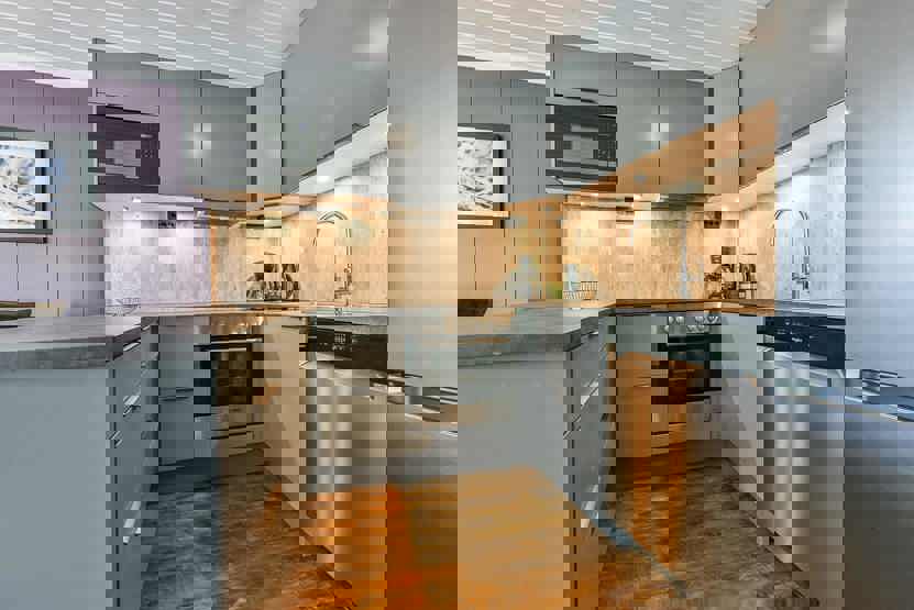 Køkken: Enheden har komfur med ovn, opvaskemaskine, mikrobølgeovn, køleskab, fryser.