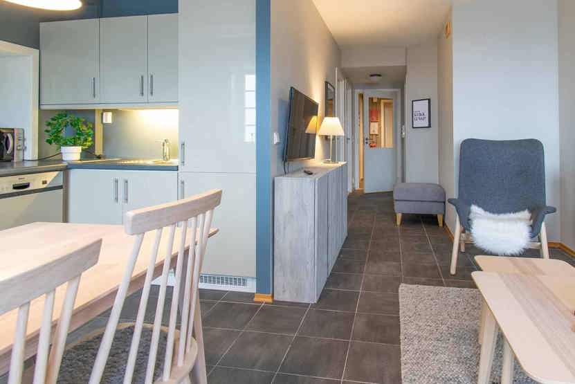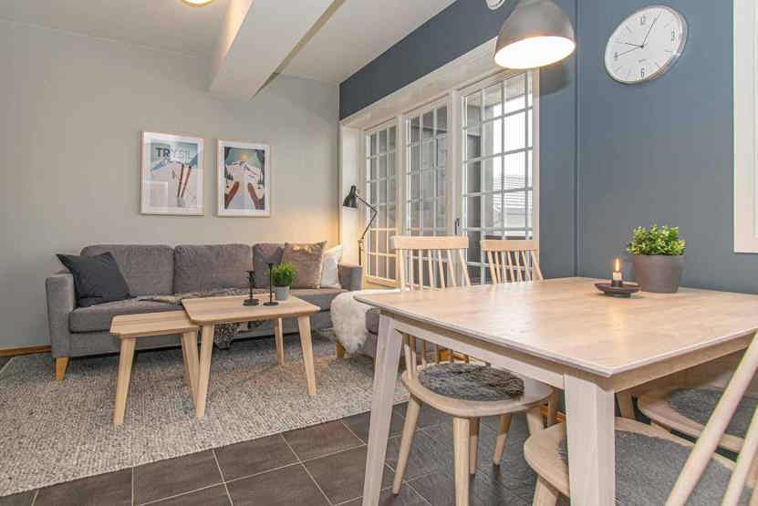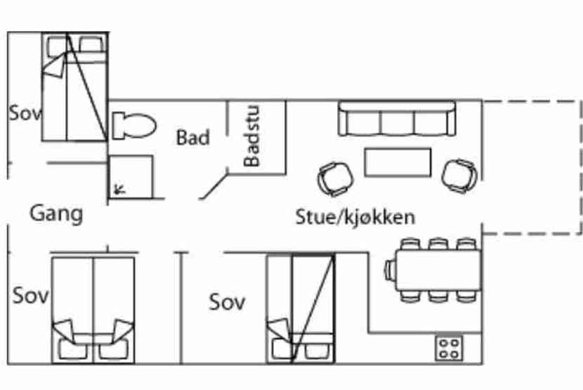Lejlighed på 1. sal, 6 sengepladser, 53 m², Opholdsstue med TV og køkkenafdeling, 3 soveværelser, 1 bruser, 1 WC, sauna, 1 tørreskab,1 garageplads maks højde garageplads 210 cm.
