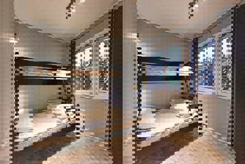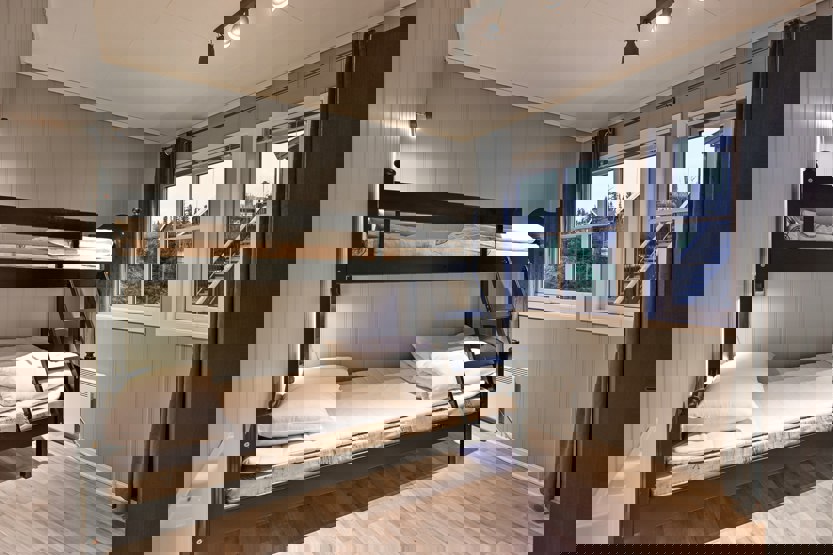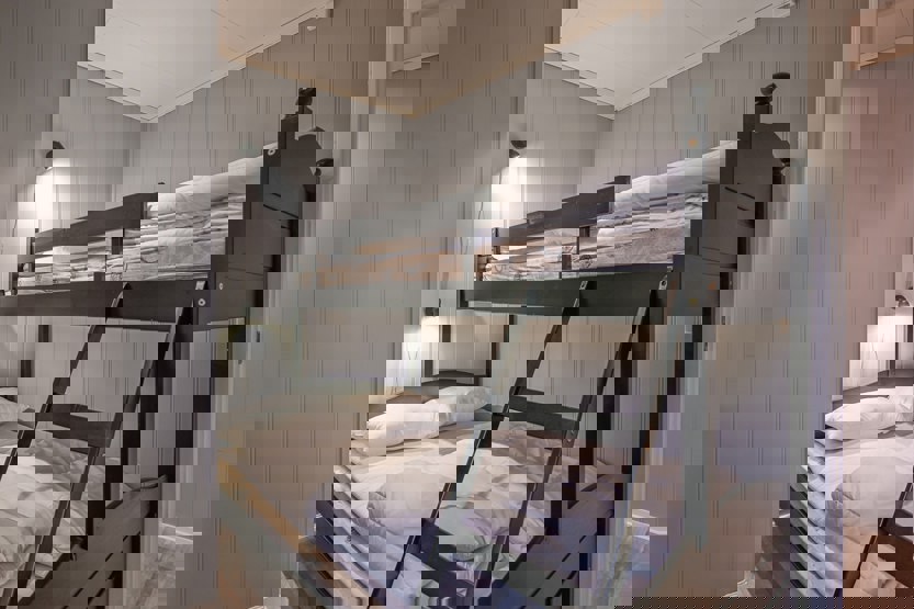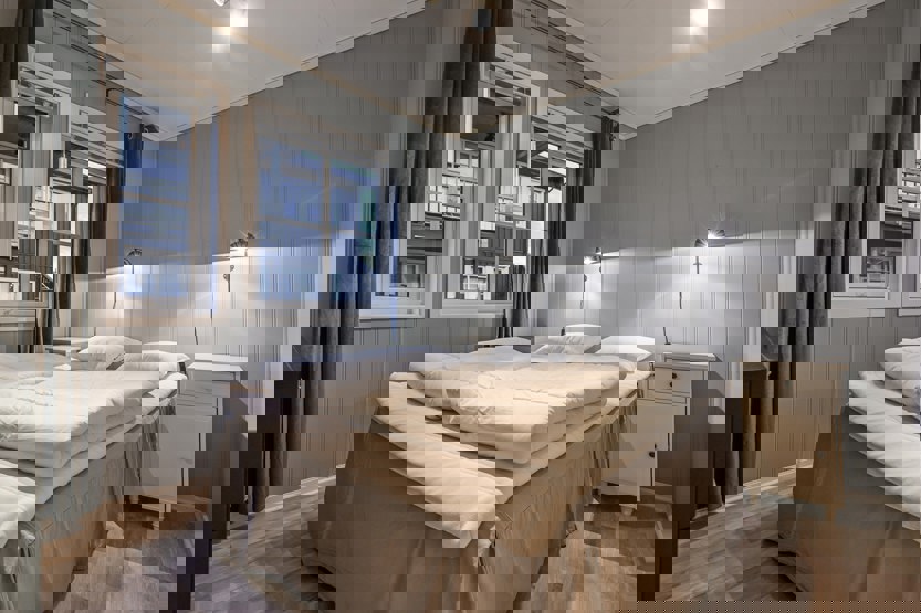 Soveværelse 1: 1 dobbeltseng 160 cm bred. Soveværelse 2: 1 køjeseng med 120 cm bred underkøje og 75 cm bred overkøje. Soveværelse 3:1 køjeseng med 120 cm bred underkøje og 75 cm bred overkøje.