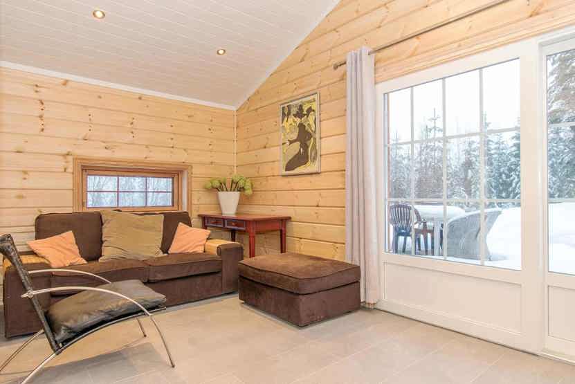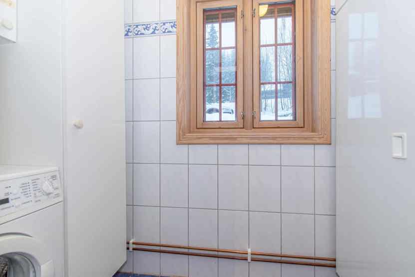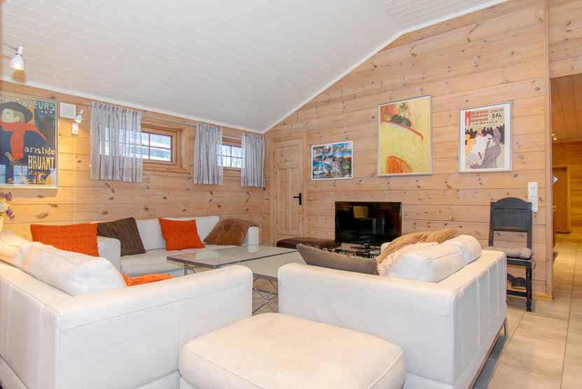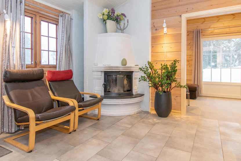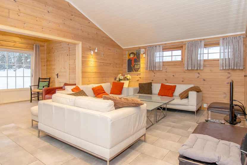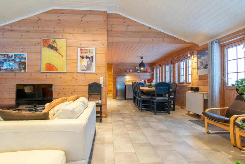 Opholdsstue med TV, pejsindstats. Vaskemaskine, tørreskab, skiopbevaring.