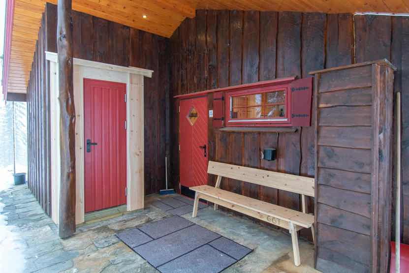 Hytten i 2 etager til 14 personer: Køkkenafdeling med spisebord til 14 personer. Opholdsstue med pejseovn, TV. 5 soveværelser. 2 brusere, 2 WC, 1 sauna, vaskemaskine.