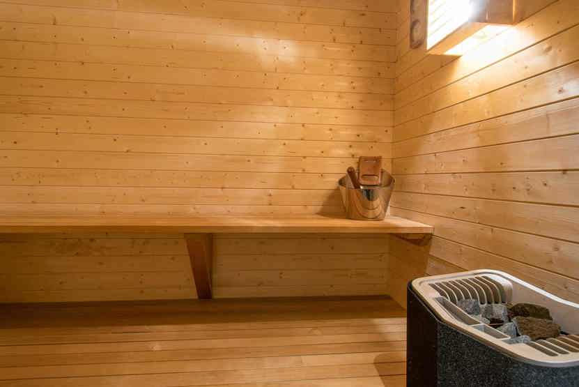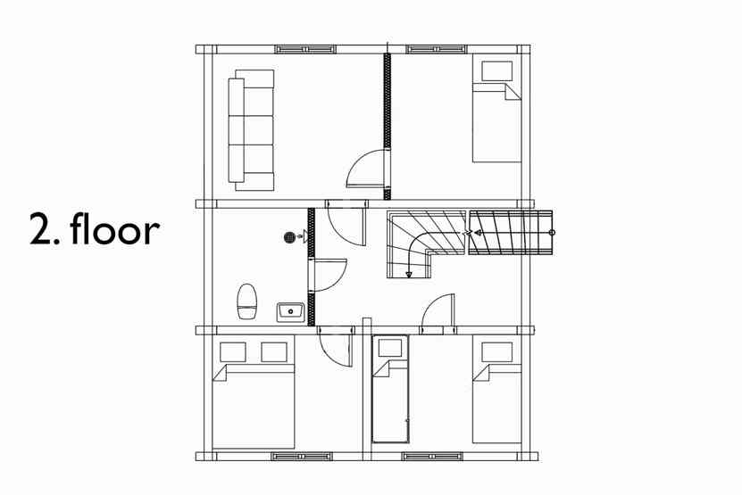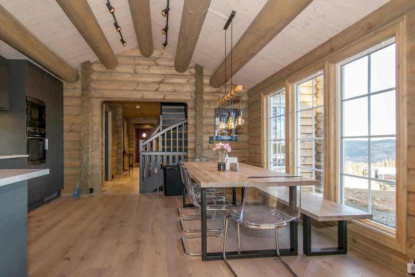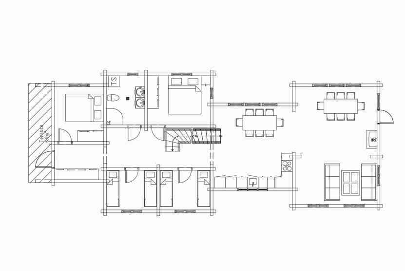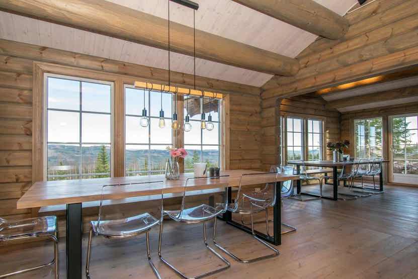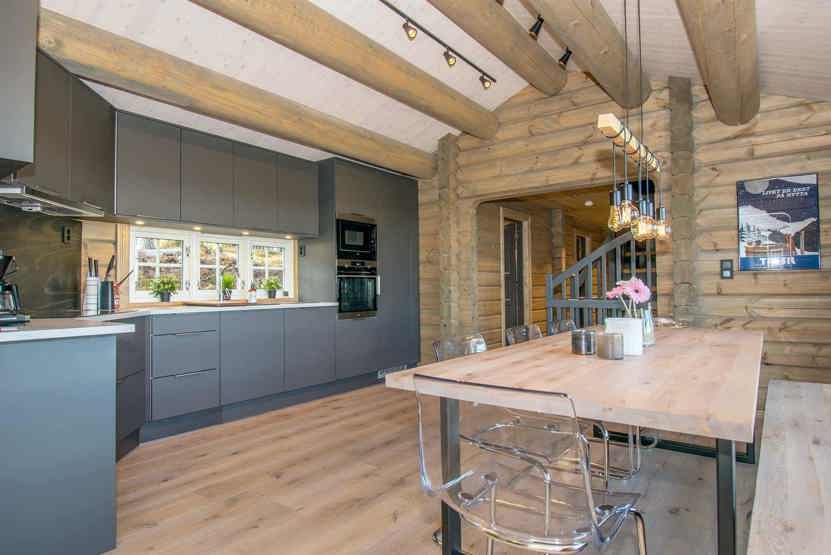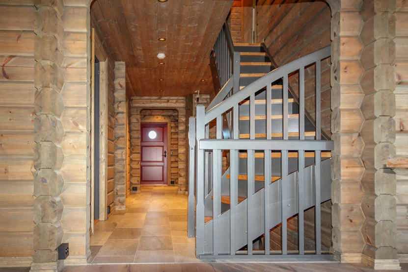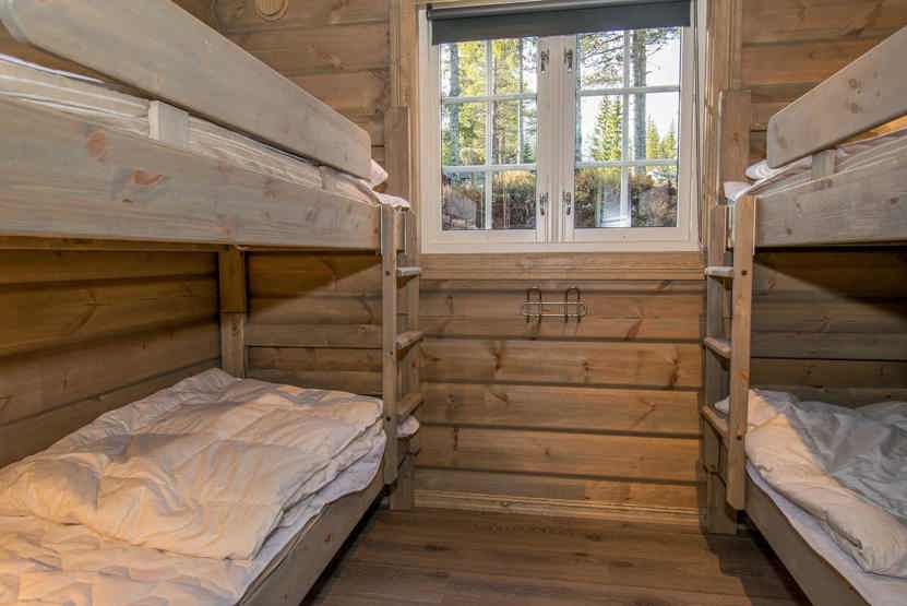 Hytte 18 personer, 150 m² fordelt på 3 etager. Opholdsstue med brændeovn og spisebord til 8-9 pers. i forlængelse af stuen, fuldt udstyret køkkenafdeling med spisebord og 8-9 siddepladser, På 1. sal mindre stue og 3 soverum. I alt 7 soveværelser. 3 brusere, 3 WC, 1 sauna. Adgang til elbilopladere med type 2 stik.