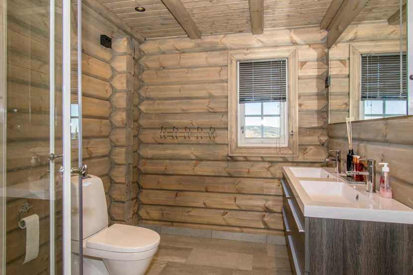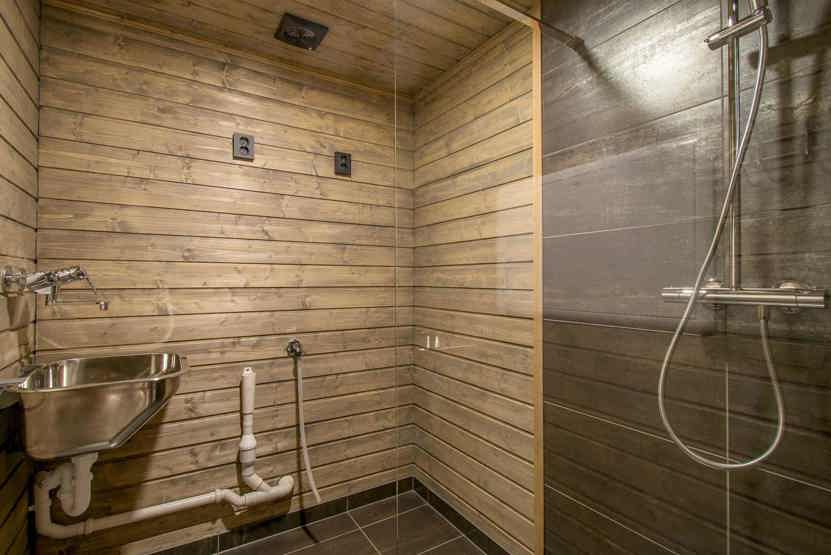 Bad 1 med bruser, WC og sauna. Bad 2 med bruser og WC. Bad 3 med bruser. Bad 4 med WC.