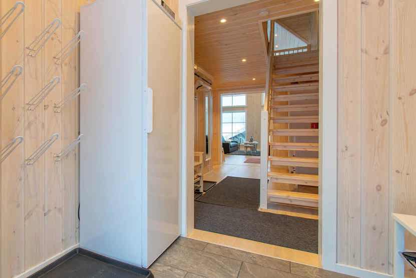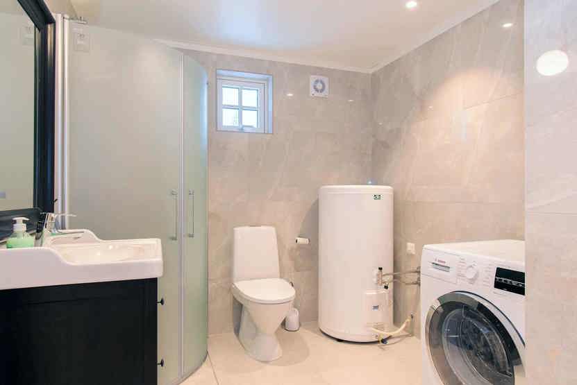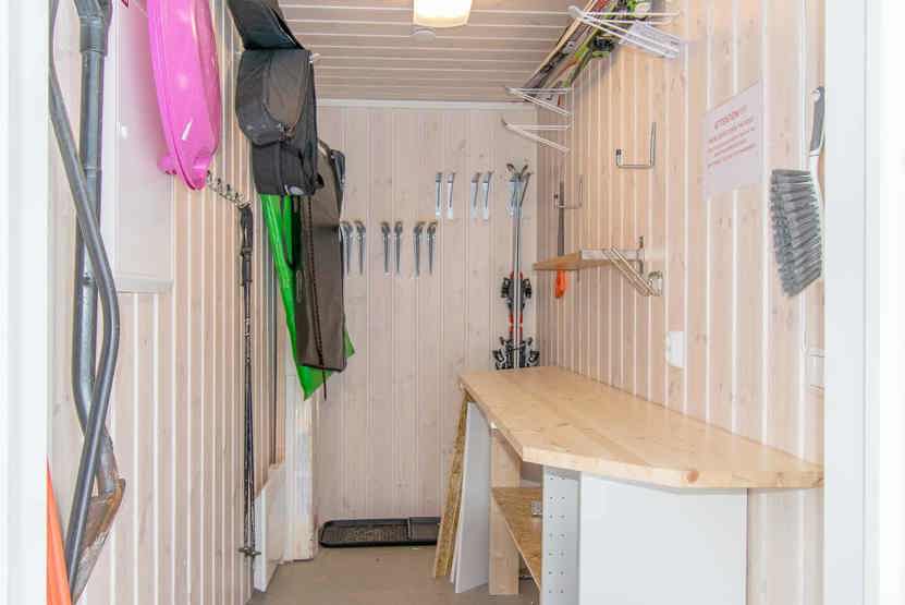 Kombineret vaskemaskine/tørretumbler, tørreskab, skiopbevaring.