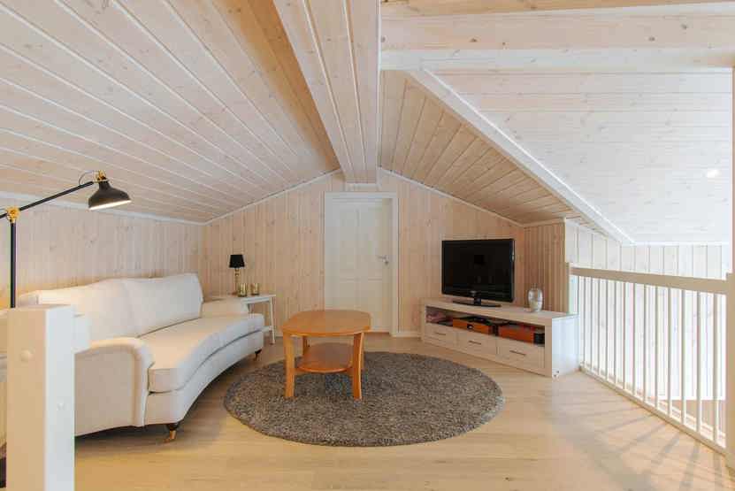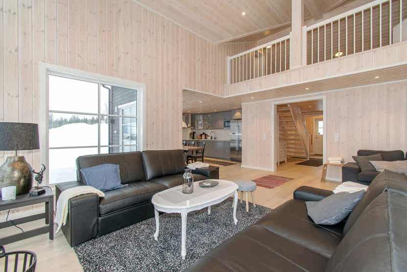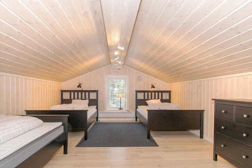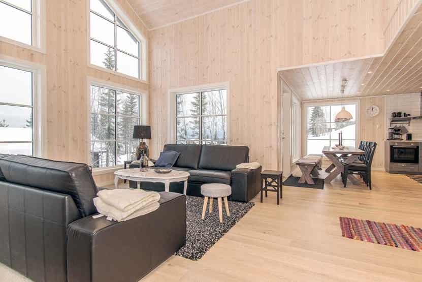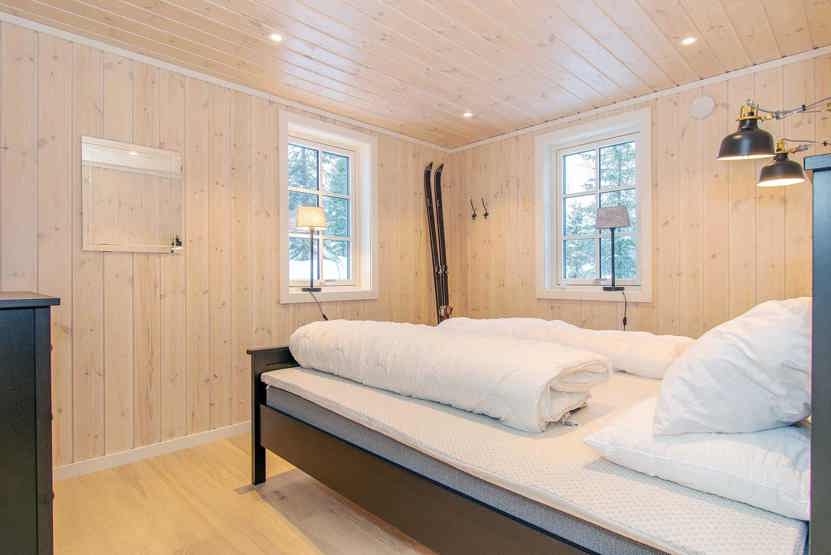Hytte 12 personer, 200 m² fordelt på 2 etager. Stor opholdsstue med brændeovn og fuldt udstyret køkkenafdeling, I tillæg mindre stue på hemsen. 5 soveværelser. 2 brusere, 2 WC, 1 sauna. Terrasse.