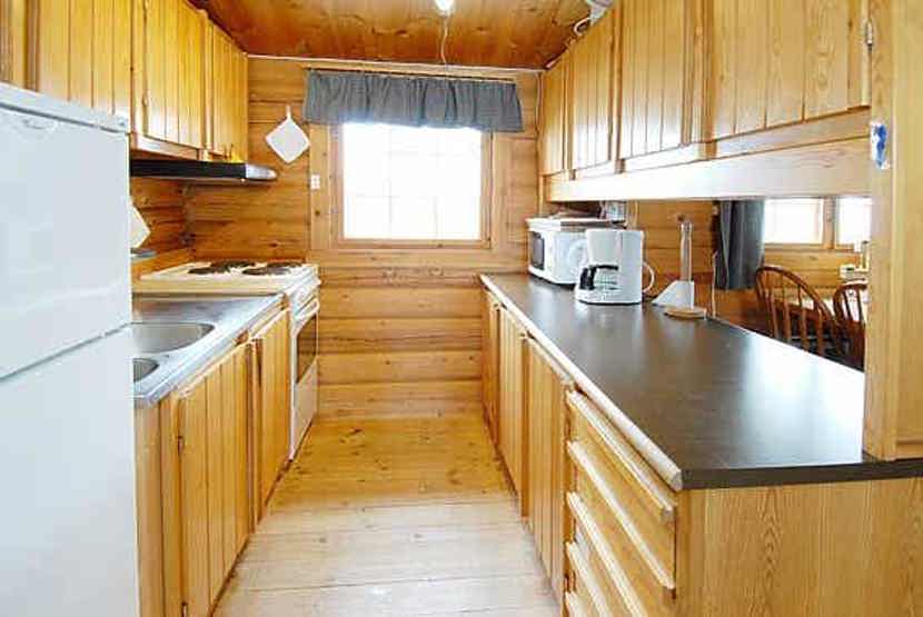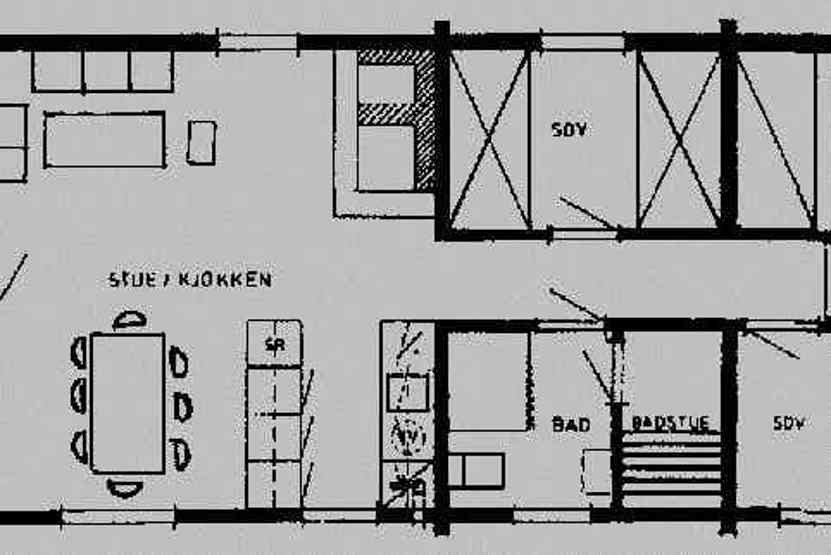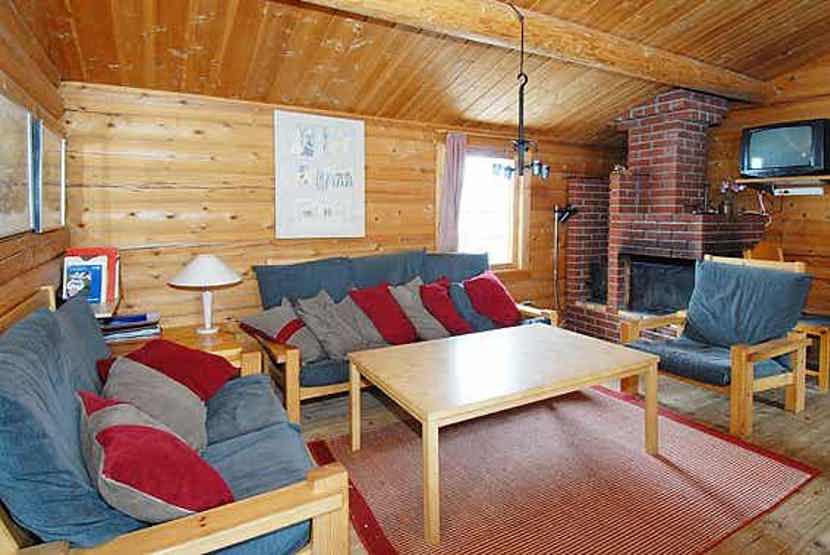 Hytte på 60 m², Opholdsstue med brændeovn, TV og køkkenafdeling. 3 soveværelser. 1 bruser, 1 WC, sauna