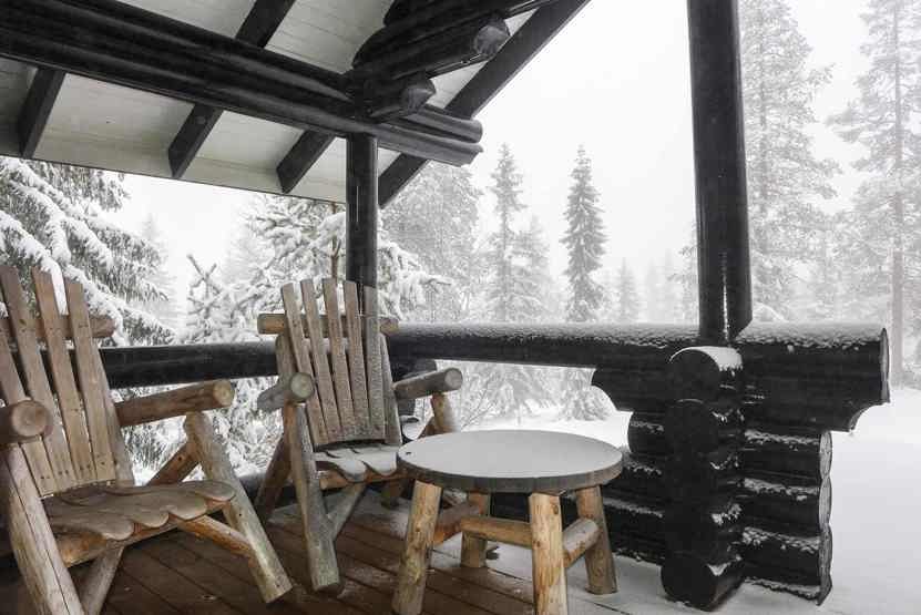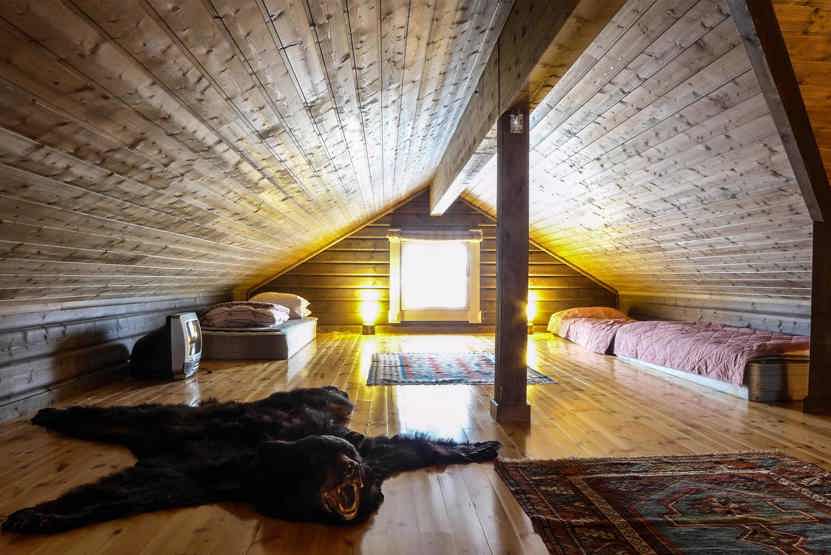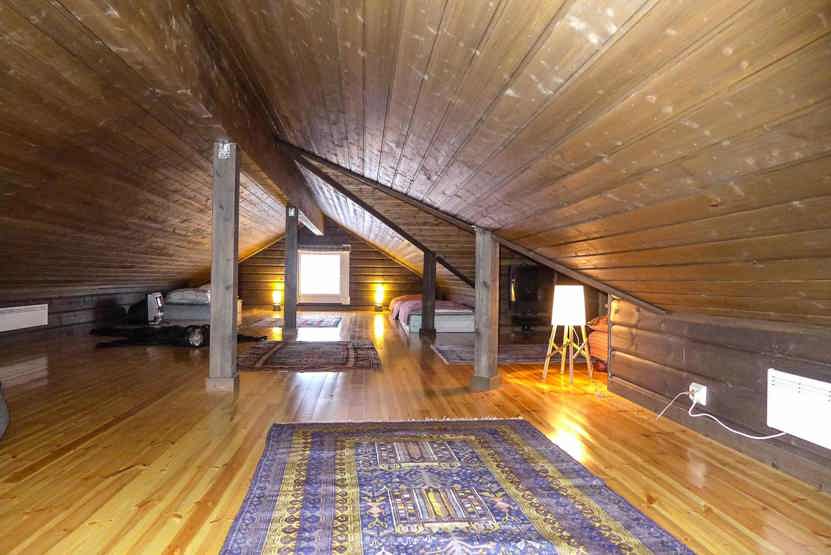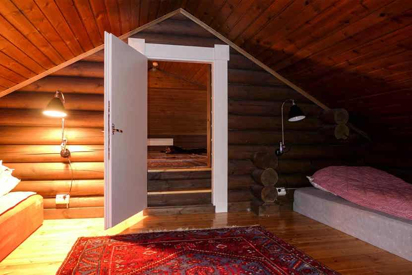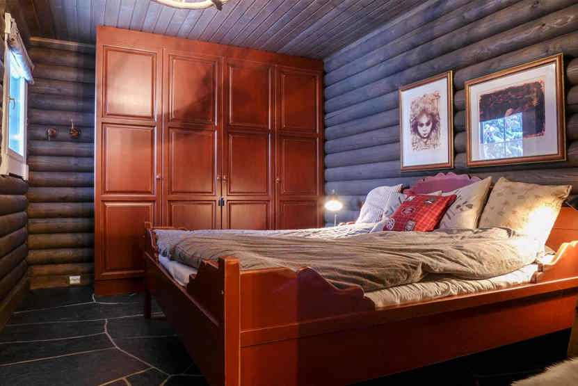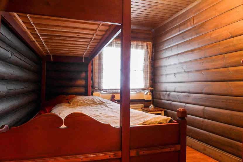 Hytte på 155 m², Køkkenafdeling med spisebord og bænke. Opholdsstue med brændeovn og TV. 3 soveværelser + lavloftet hems med 3 madreasser, 2 enkeltsenge. 2 brusere, 2 WC. 1 sauna, Terrasse.