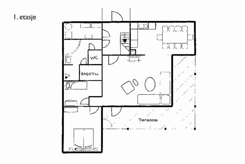 Hytte på 158 m² fordelt på kombineret opholdsstue med pejs og TV og fuldt udstyret køkkenafdeling. I tillæg mindre stue på 1. sal. 6 soveværelser. 2 brusere, 2 WC. 1 sauna, boblebad, Overdækket terrasse.