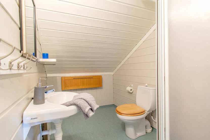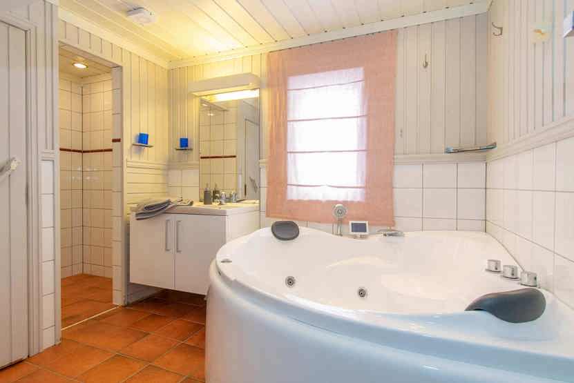 Bad 1: Bruser, WC, sauna og boblebad. Bad 2: Bruser og WC.