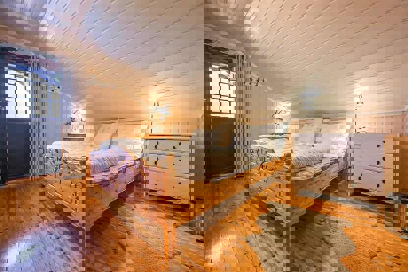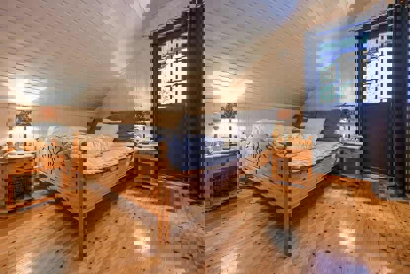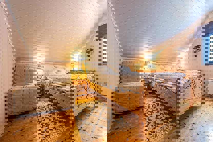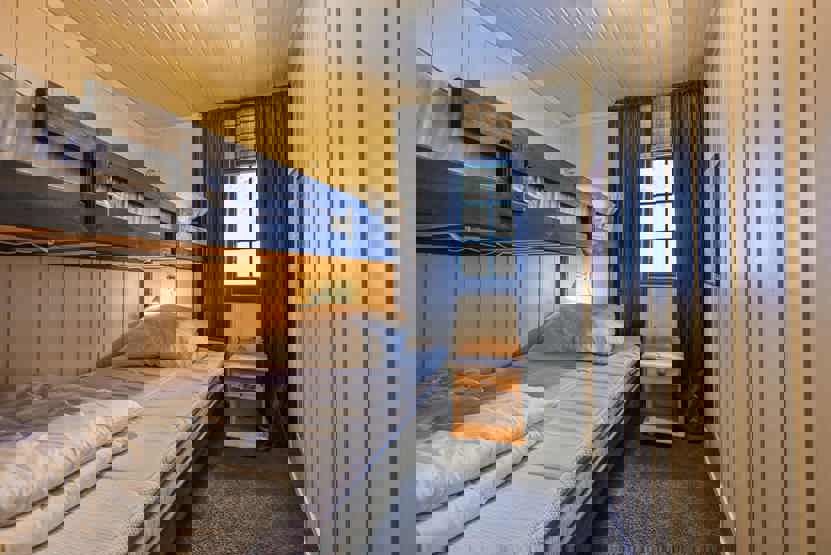 Soveværelse 1 + 2: 1 dobbeltseng 150 cm bred. Soveværelse 3: 1 dobbeltseng 150 cm bred. Soveværelse 4: 1 køjeseng med 120 cm bred underkøje og 90 cm bred overkøje * 190 cm lang.