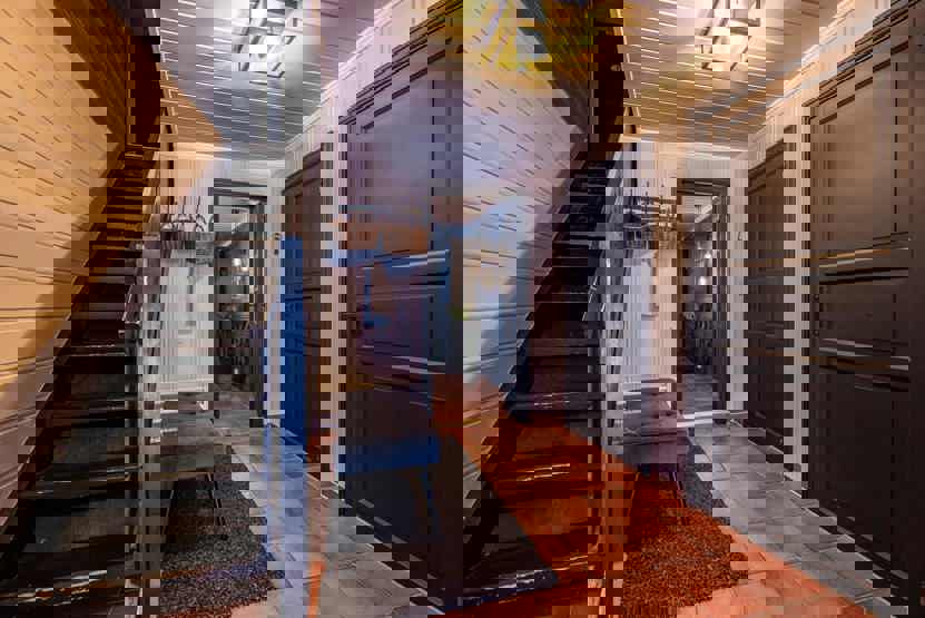 Hytte i 2 etager på 130 m², Køkken / spiseafdeling. stor stue i forlængelse af køkkenafdeling med TV, brændeovn. 4 soveværelser (Nogle er lavloftet og med skrå vægge). 2 brusere, 2 WC, 1 sauna, vaskemaskine. 4 parkeringspladser. Adgang til elbilopladere med type 2 stik mod betaling.
