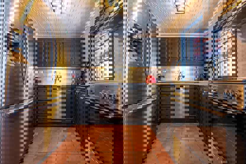 Køkken: Enheden har komfur med ovn, køleskab, fryser, opvaskemaskine, mikrobølgeovn.