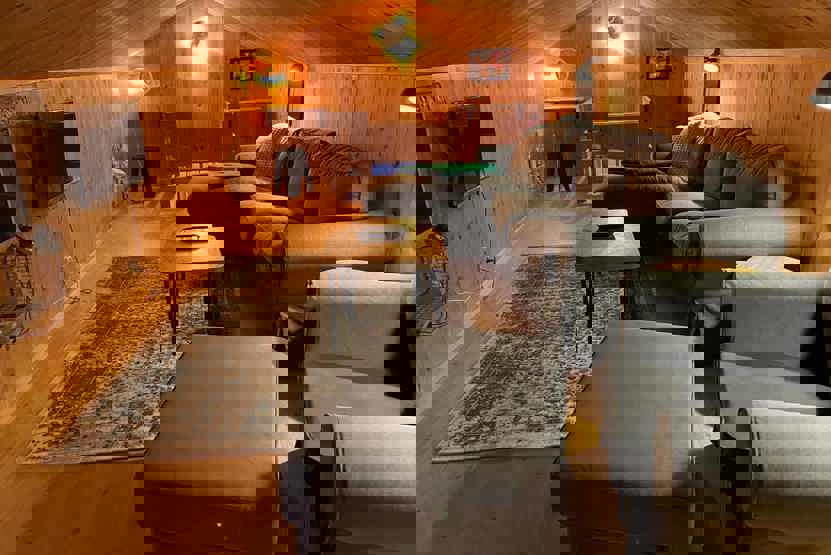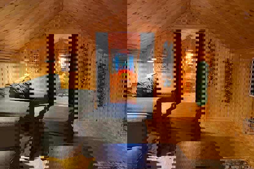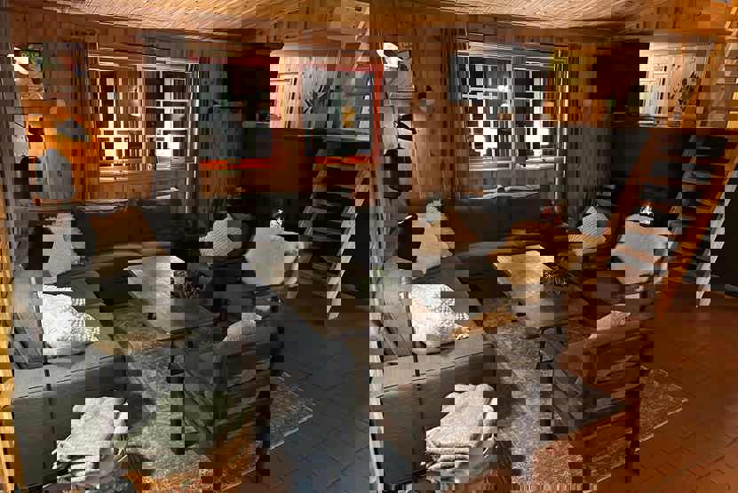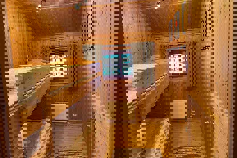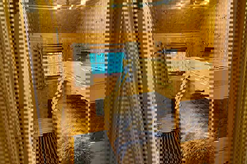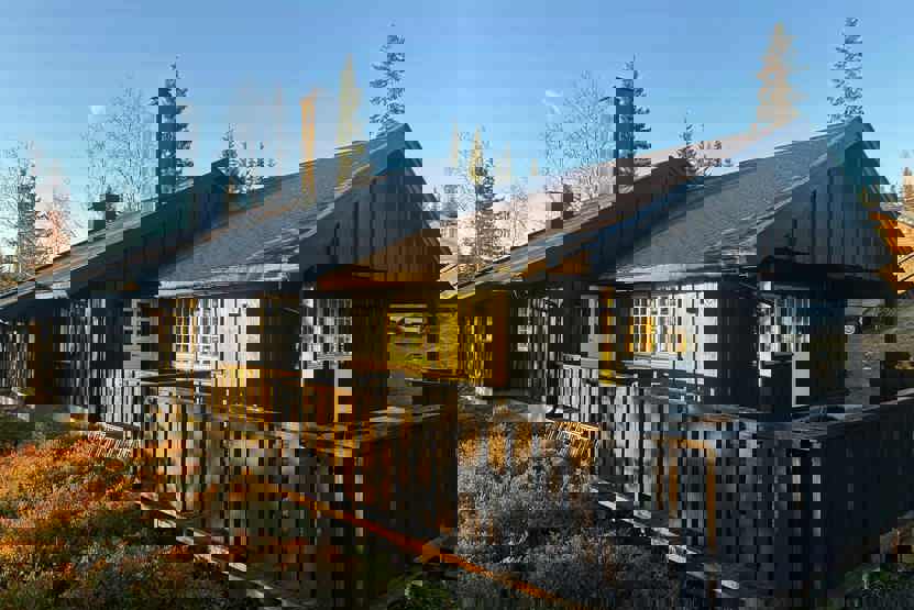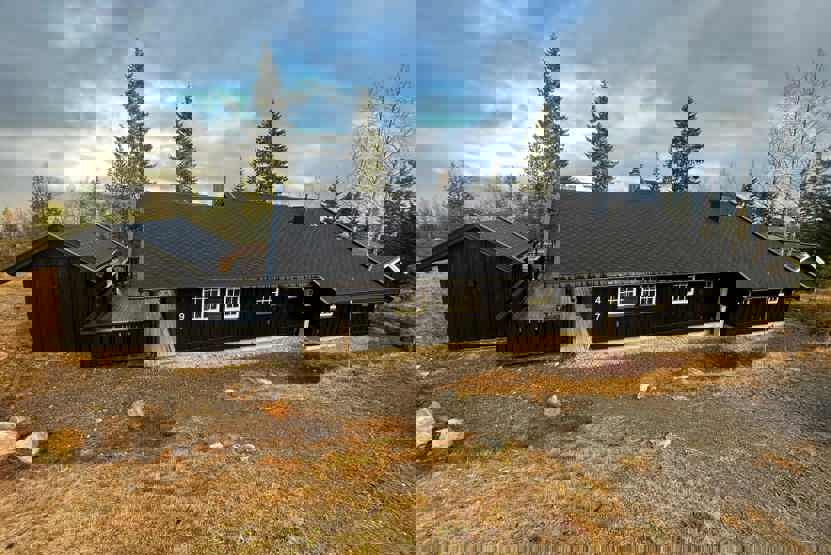 8+2 personers hytte med hems, Opholdsstue med brændeovn og TV og køkkenafdeling, 3 soveværelser + hems, 3 brusere, 3 WC, 1 sauna.