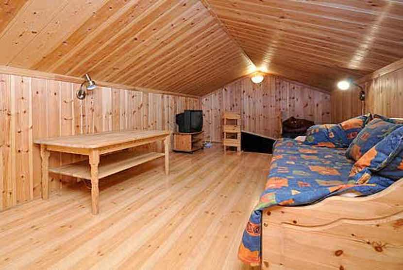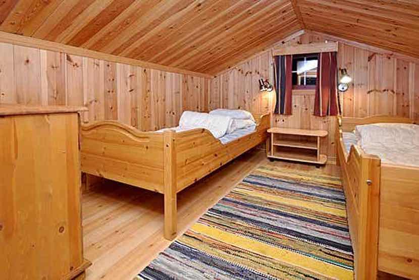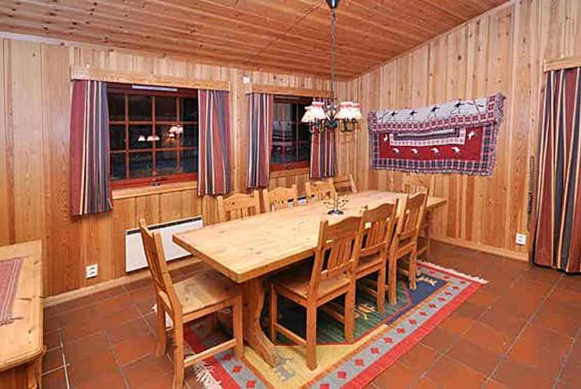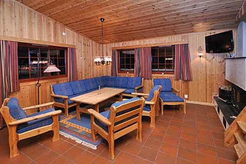 8+2 personers hytte med hems, Opholdsstue med brændeovn og TV og køkkenafdeling, 3 soveværelser + hems, 3 brusere, 3 WC, 1 sauna.