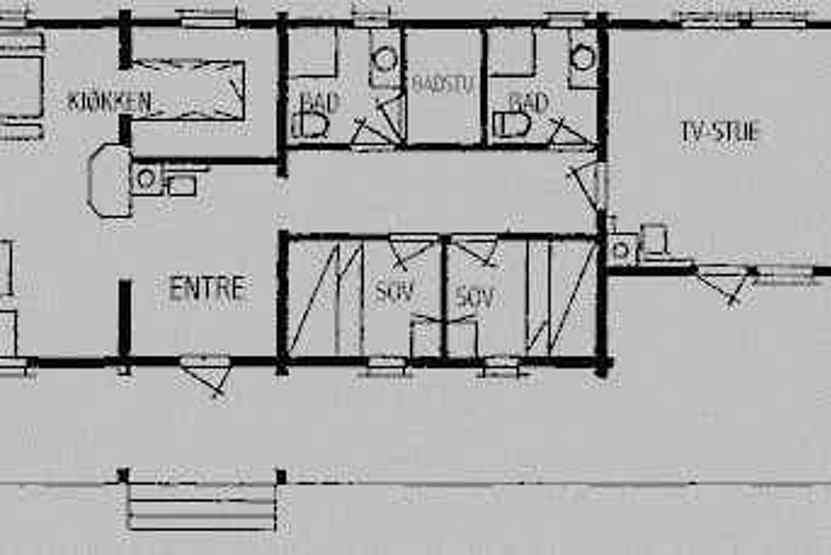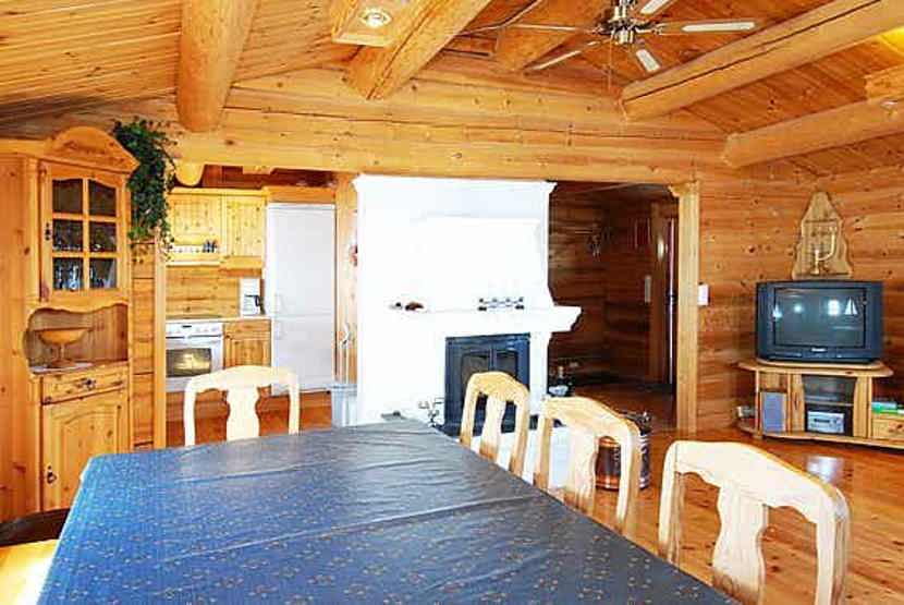 Hytte på 110 m². Opholdsstue med pejs og TV. Køkkenafdeling, 3 soveværelser. 2 brusere, 2 WC. 1 sauna. Terrasse.