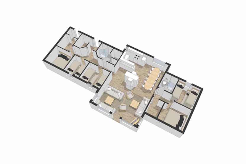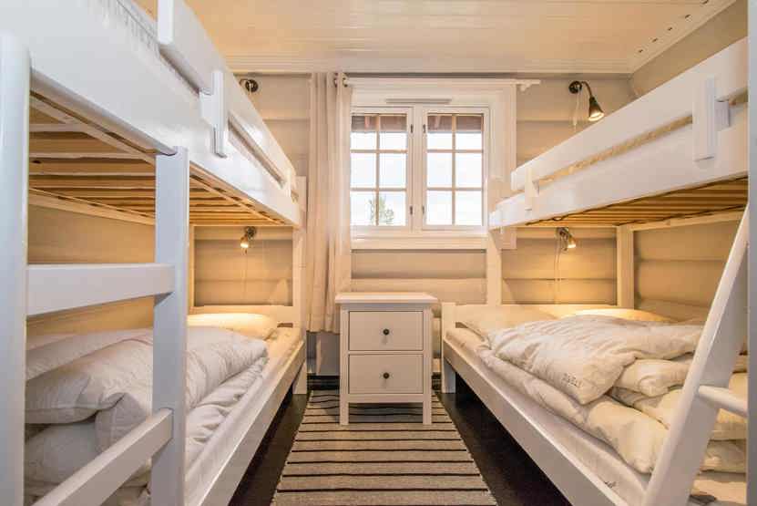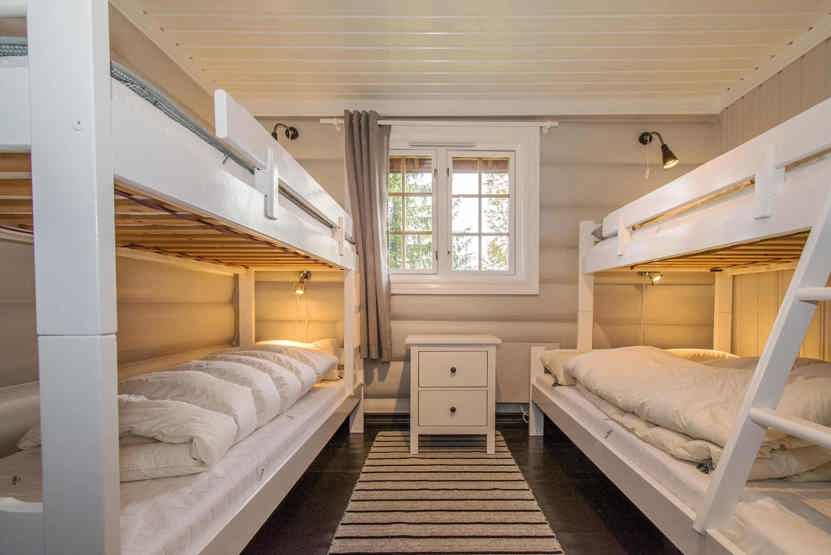 Soveværelse 1 + 2: 1 dobbeltseng. Soveværelse 3: 1 køjeseng med 120 cm bred underkøje, 1 køjeseng. Soveværelse 4: 1 køjeseng med 120 cm bred underkøje, 1 køjeseng. Soveværelse 5: 2 enkeltsenge.