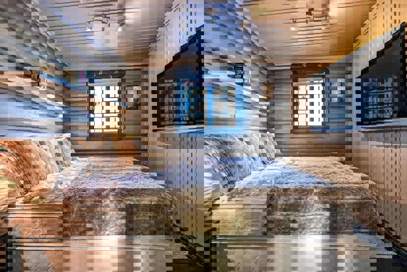 Soveværelse 1+2: 1 dobbeltseng 160 cm bred. Soveværelse 3: 1 køjeseng 75 cm bred. Soveværelse 4: 1 køjeseng med 80 cm bred. Soveværelse 5: 1 dobbeltseng 150 cm bred. Soveværelse 6: 1 dobbeltseng 160 cm bred.