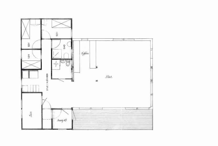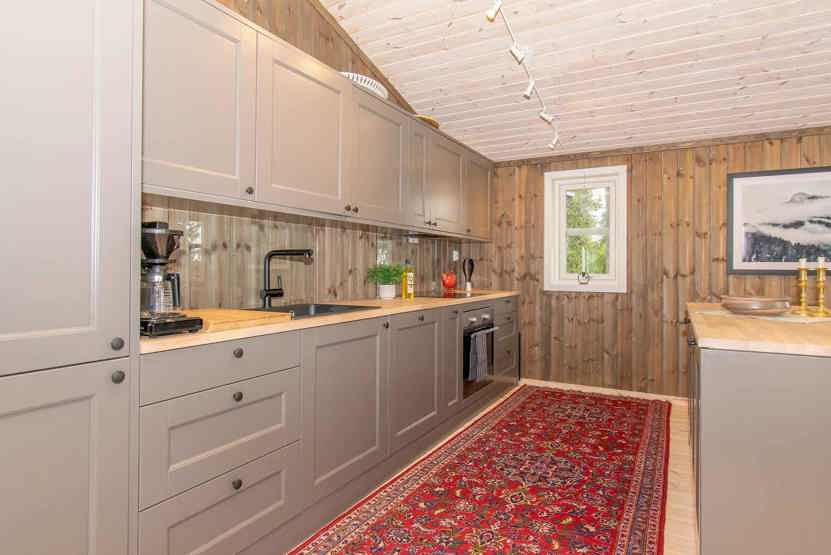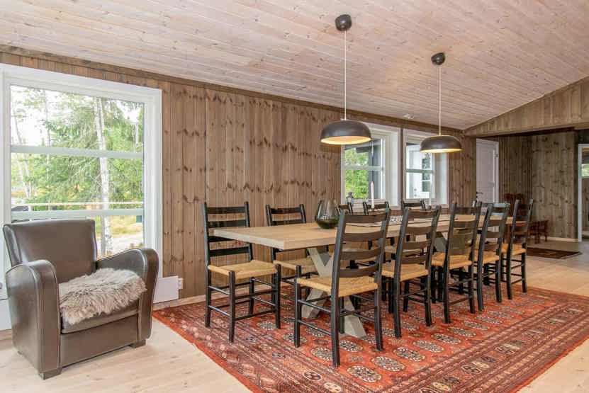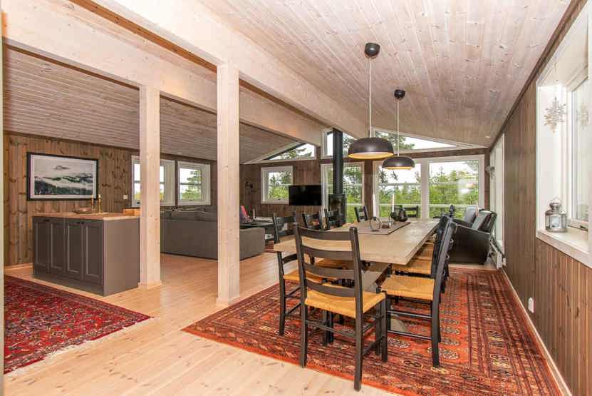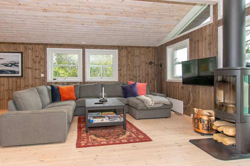 8 personers hytte, 98 m², Stor og hyggelig opholdsstue med køkkenafdeling, spiseplads, sofagruppe, brændeovn, TV. 4 soveværelser, 2 brusere, 2 WC. Terrasse.