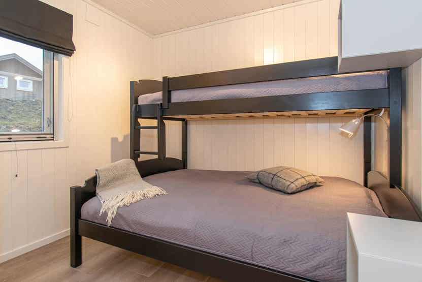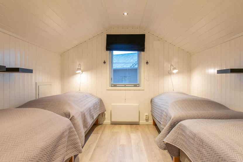 Soveværelse 1: 1 dobbeltseng 180 cm bred. Soveværelse 2: 1 køjeseng med 150 cm bred underkøje og 90 cm bred overkøje. Soveværelse 3: 1 dobbeltseng 180 cm bred. Soveværelse 4: 4 enkeltsenge.
