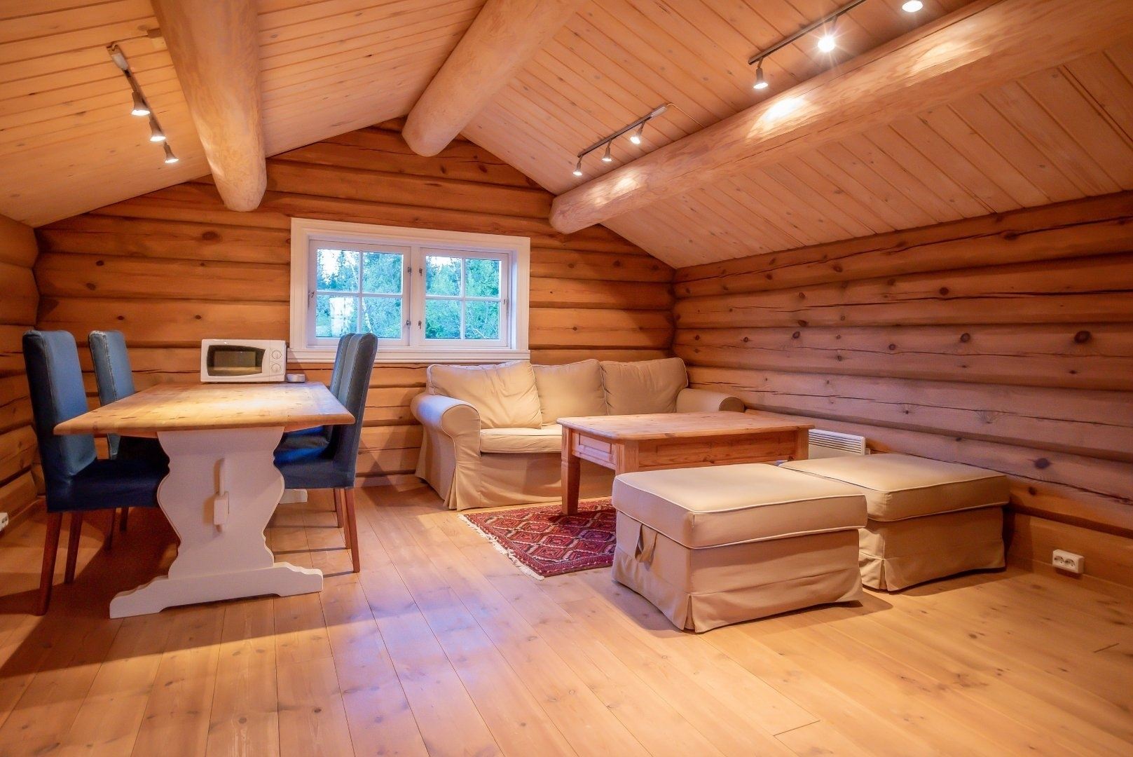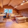Hytte med 5 senge, 34 m², 2 soverum. Åben planløsning med opholdsstue med brændeovn, TV og køkkenafdeling. 2 soveværelser. 1 bruser, 1 WC, sauna.