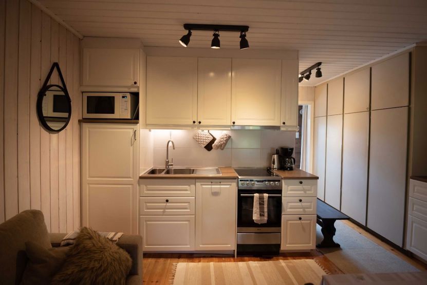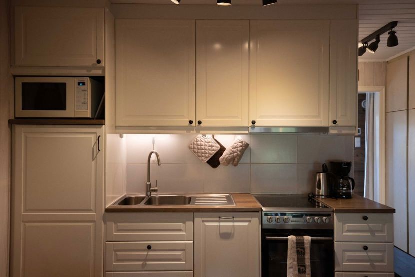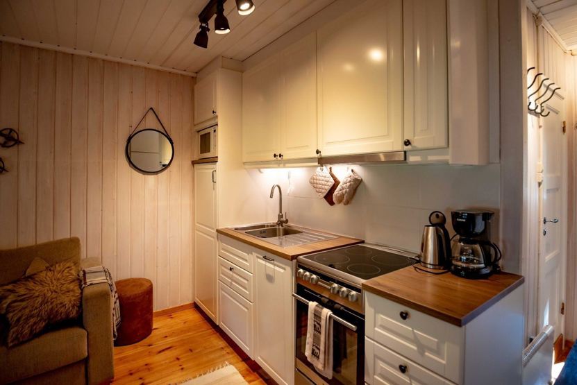 Enheden har komfur, ovn, køleskab med lille fryser, opvaskemaskine, mikrobølgeovn.