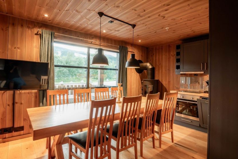 Åben planløsning med køkkenafdeling med spiseplads, sofagruppe og brændeovn. 1 bruser, 1 WC, 1 sauna. 1 garageplads. Skibod.