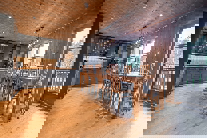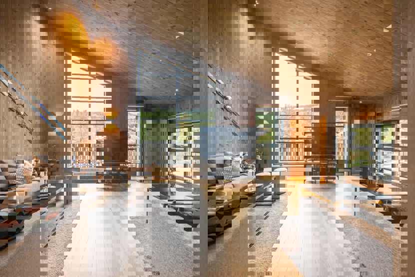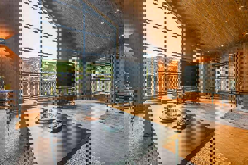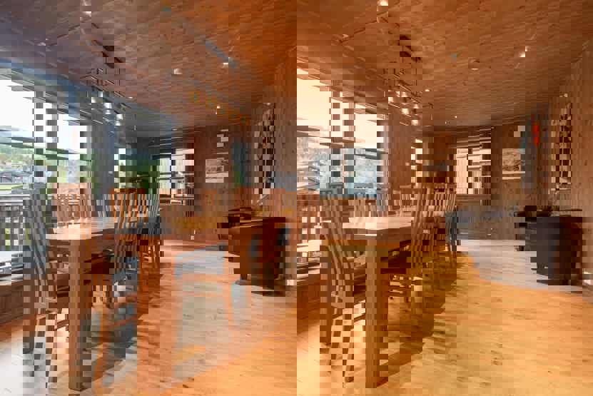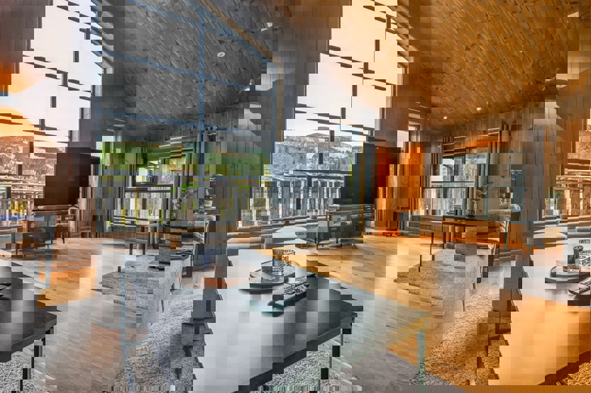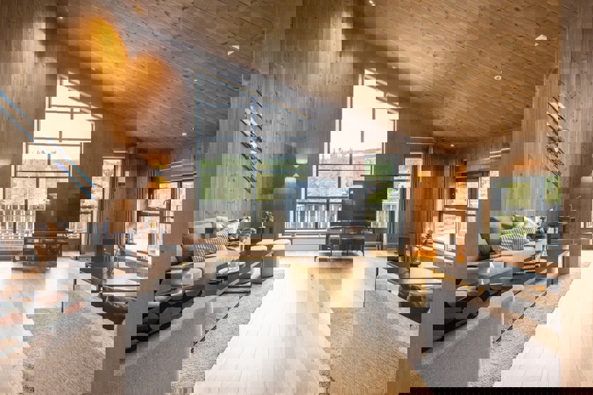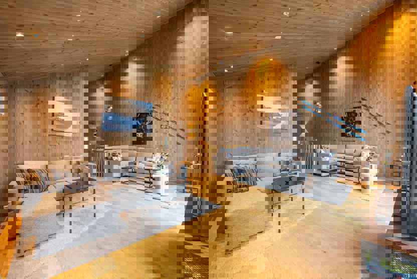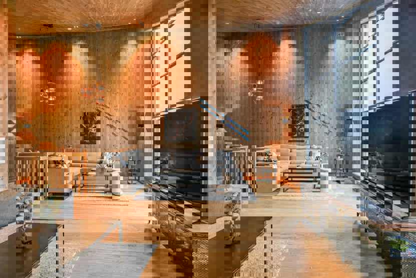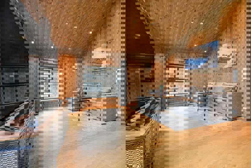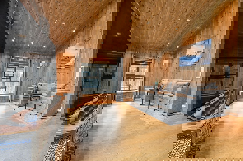 Åben planløsning med køkkenafdeling med spiseplads, sofagruppe og brændeovn. På 1. sal Stue med med TV, 2 brusere, 2 WC, 1 sauna, vaskemaskine. Skiopbevaring. 2 garagepladser. Byggestøj kan forekomme.