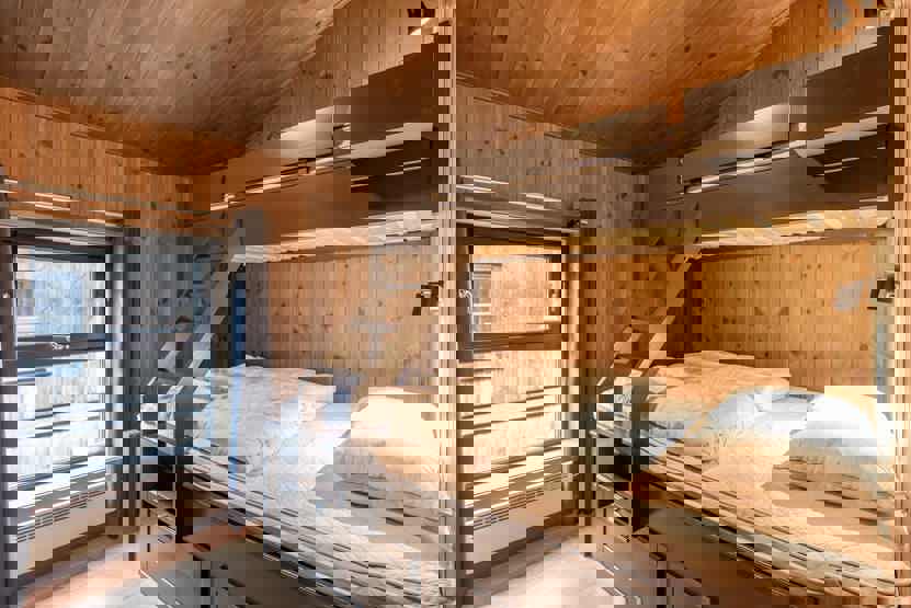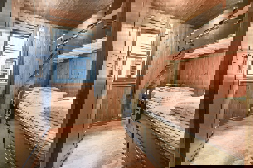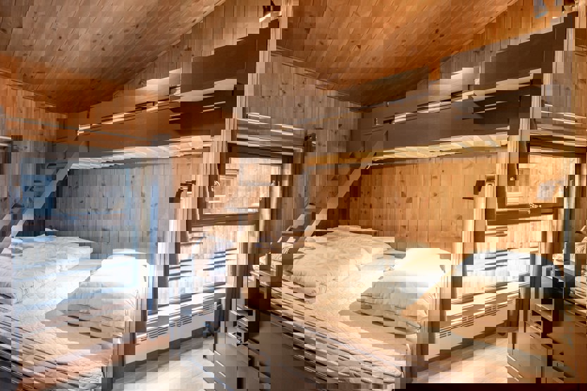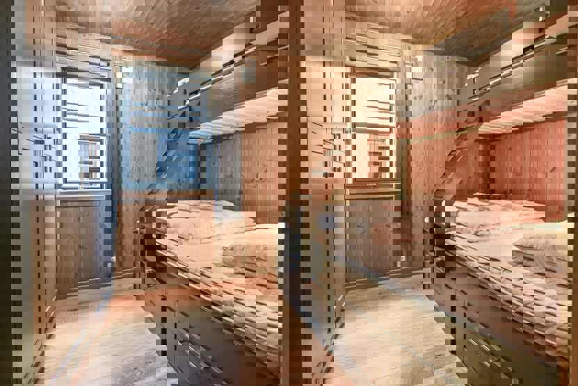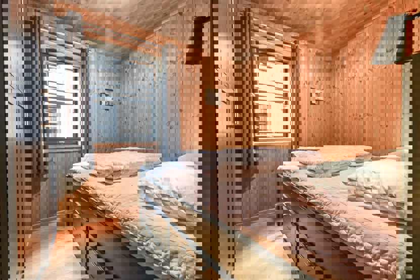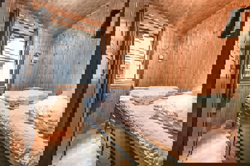 Soveværelse 1: 1 dobbeltseng 180 cm bred. Soveværelse 2: 1 køjeseng med 150 cm bred underkøje og 90 cm bred overkøje. Soveværelse 3: 1 køjeseng med 150 cm bred underkøje og 90 cm bred overkøje. Soveværelse 4: 1 dobbeltseng 180 cm bred.