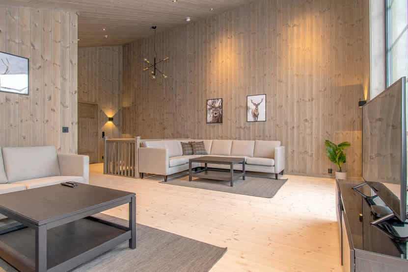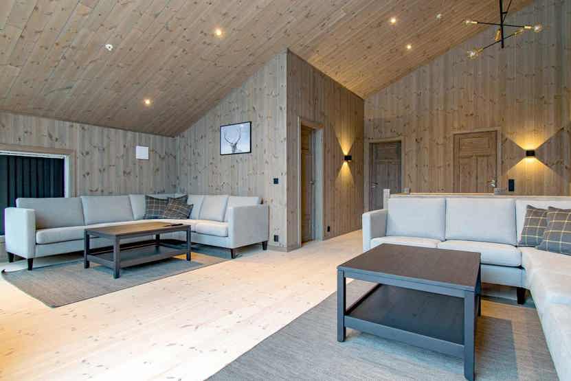 Åben planløsning med køkkenafdeling med spiseplads, sofagruppe og brændeovn. På 1. sal Stue med med TV, 2 brusere, 2 WC, 1 sauna, vaskemaskine. 2 garagepladser. Byggestøj kan forekomme.