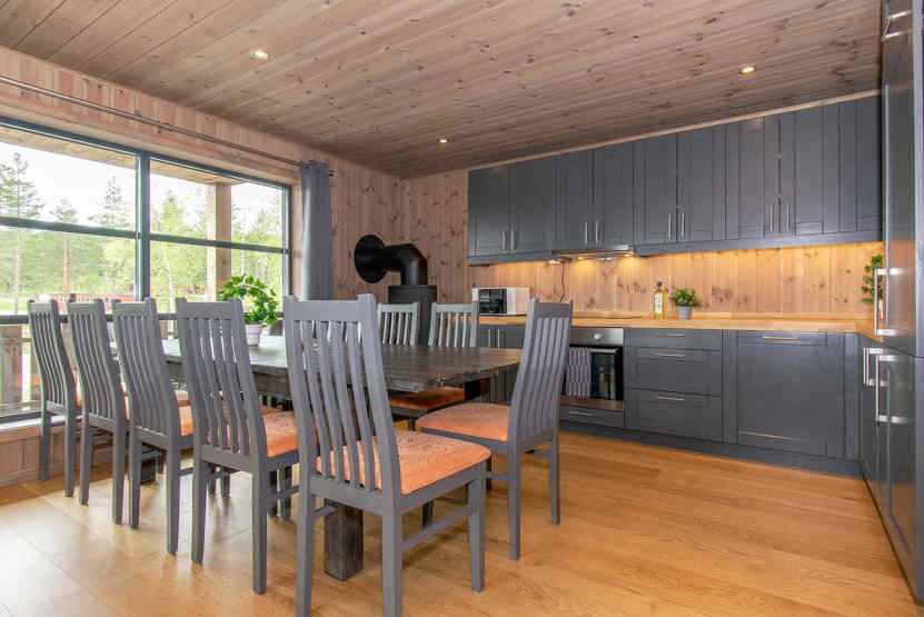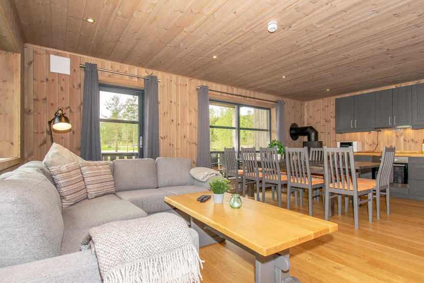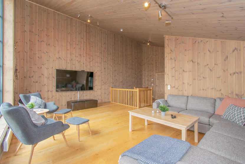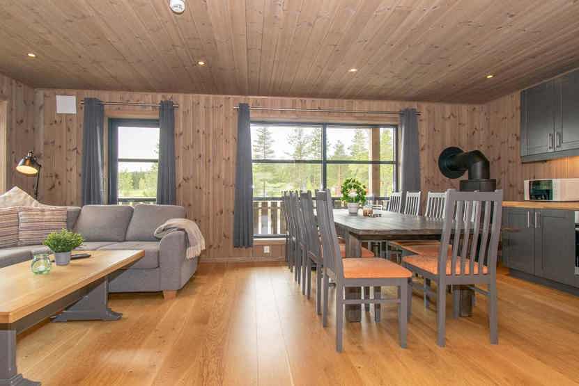 Åben planløsning med køkkenafdeling med bænke, stole og spisebord til 10 personer. Mindre sofagruppe og brændeovn. På 1. sal stor stue med højt til loftet og vinduer fra gulv til loft, sofagruppe, TV. 2 brusere, 2 WC, 1 sauna, vaskemaskine. 2 garagepladser. Byggestøj kan forekomme.
