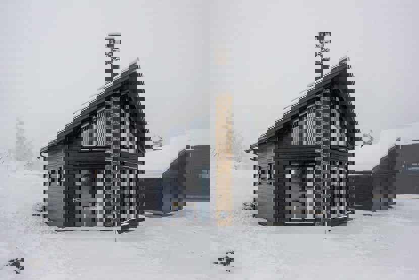 Hytte med hems, 43 m², opholdsstue med køkkenafdeling, 4 sengepladser, WC, brusere.